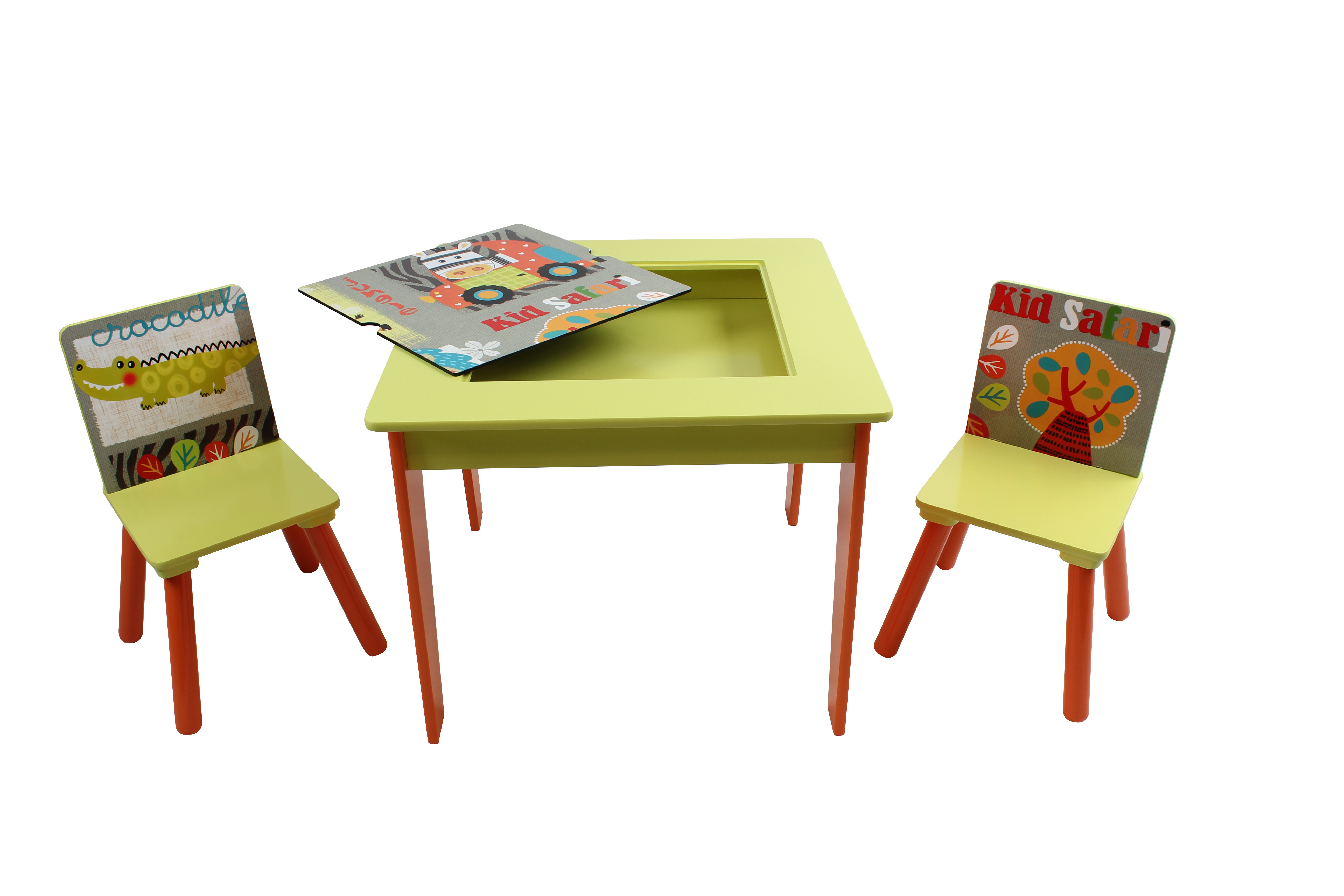 Set arredo cameretta composto da tavolino double face con lavagna incorporata e due sedie abbinate. Il set è fatto in legno di alta qualità decorato a tema giungla.