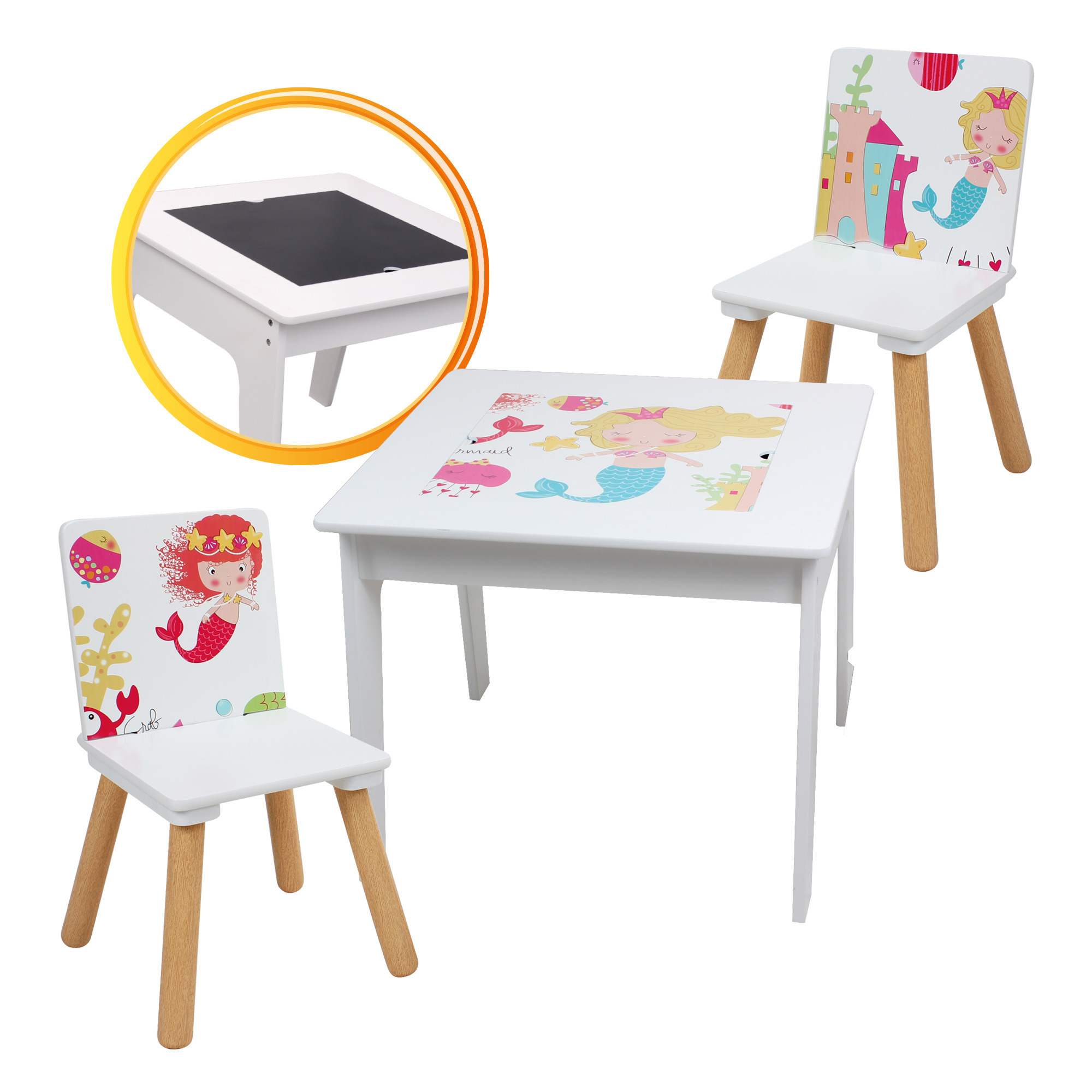 Set arredo cameretta composto da tavolino double face con lavagna incorporata e due sedie abbinate. Il set è fatto in legno di alta qualità decorato a tema sirena.