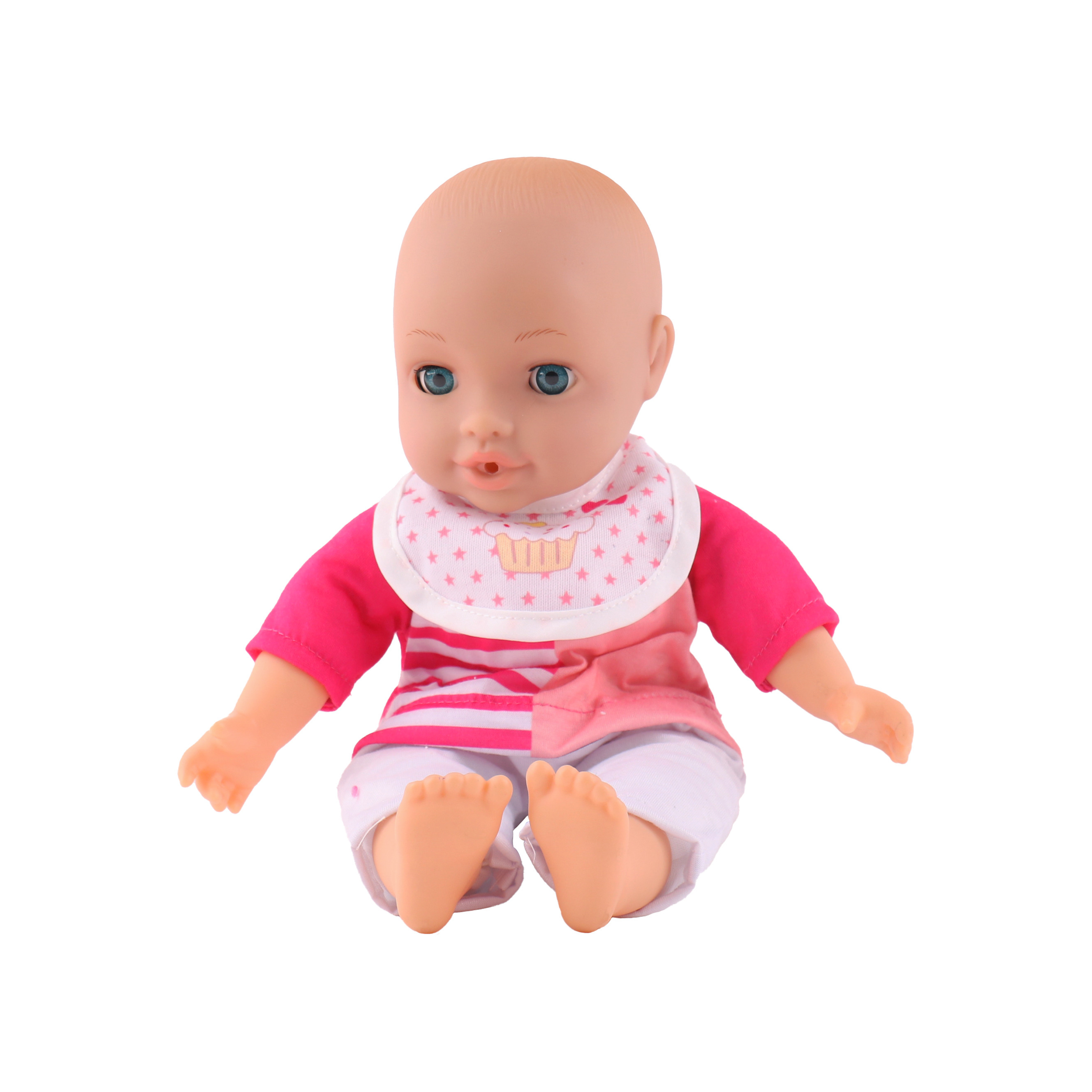 Bambola dal corpo morbido e arti in vinile. Premendo il pancino, emette versi. Biberon, piattino e posate inclusi. Altezza bambola: 30 cm.