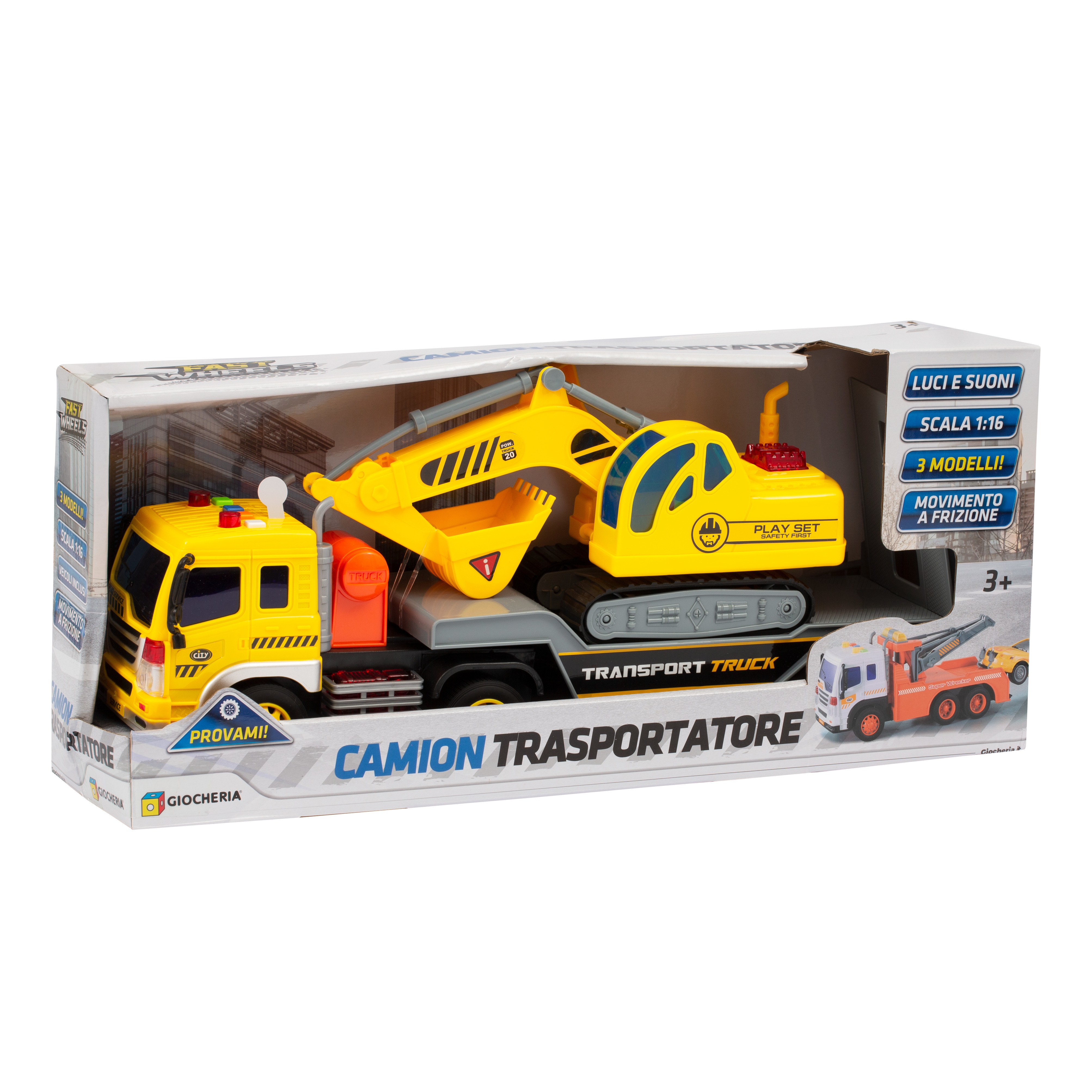Mezzi da lavoro articolati, in scala 1:16 con luci e suoni. Premendo i pulsanti si attivano luci e suoni e si aziona il braccio meccanico dell’autocarro. Assortito in 3 modelli, ciascuno con un veicolo diverso