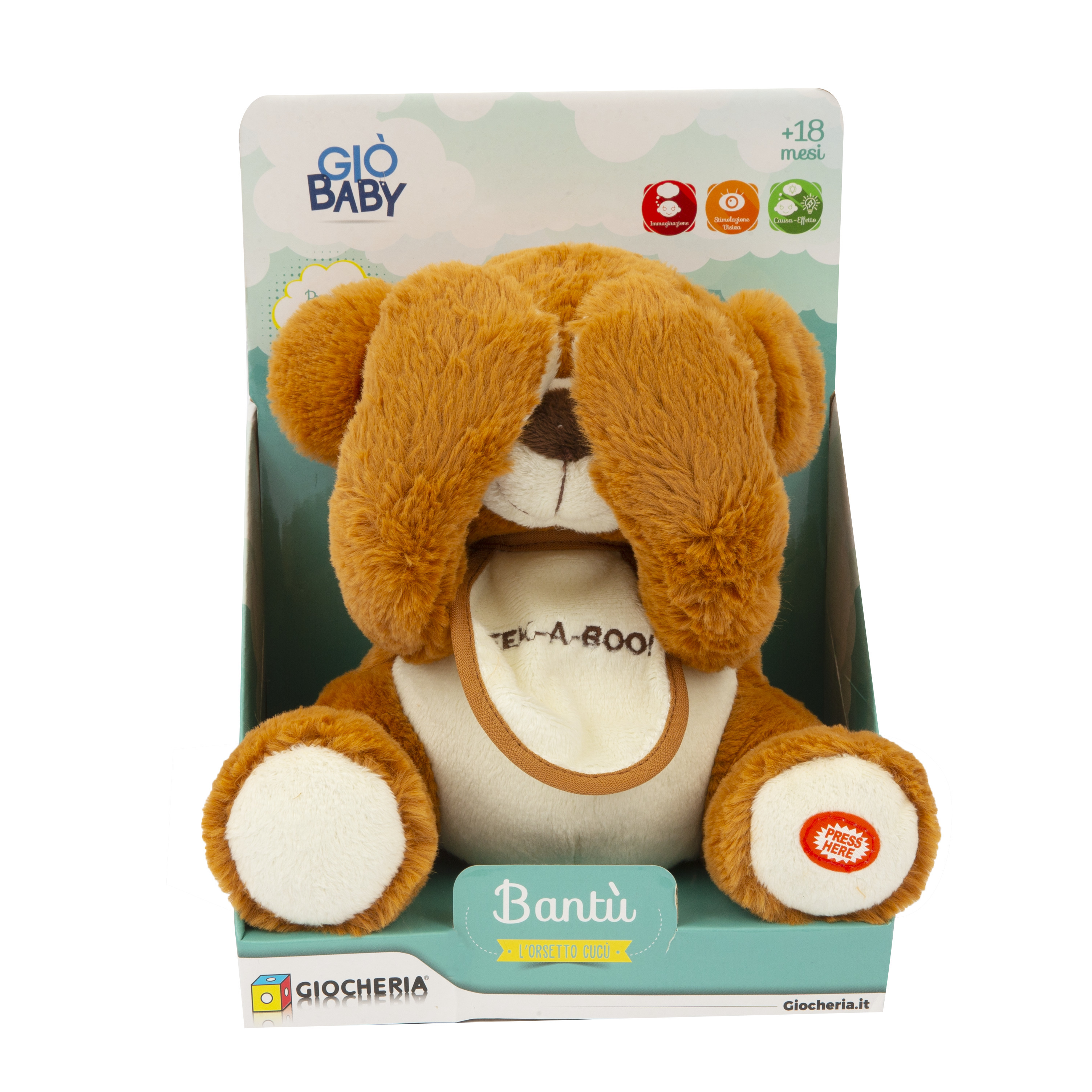 Bantù è un morbido peluche che gioca a nascondino. Si nasconde gli occhi con le zampette per fare poi…Cucù! Varie frasi incluse.