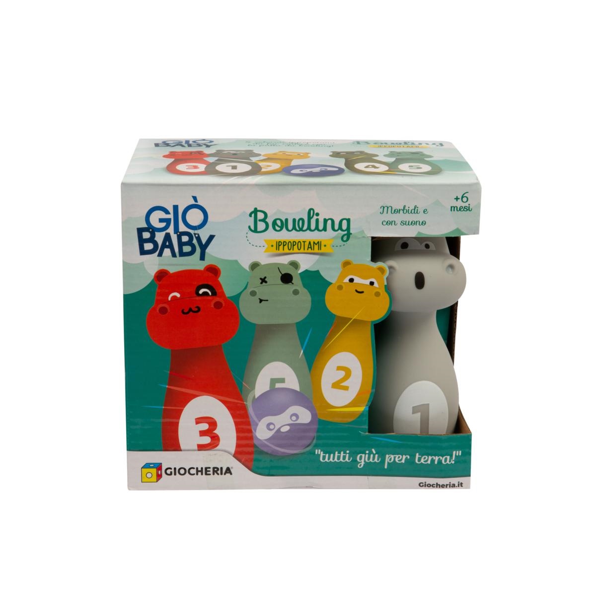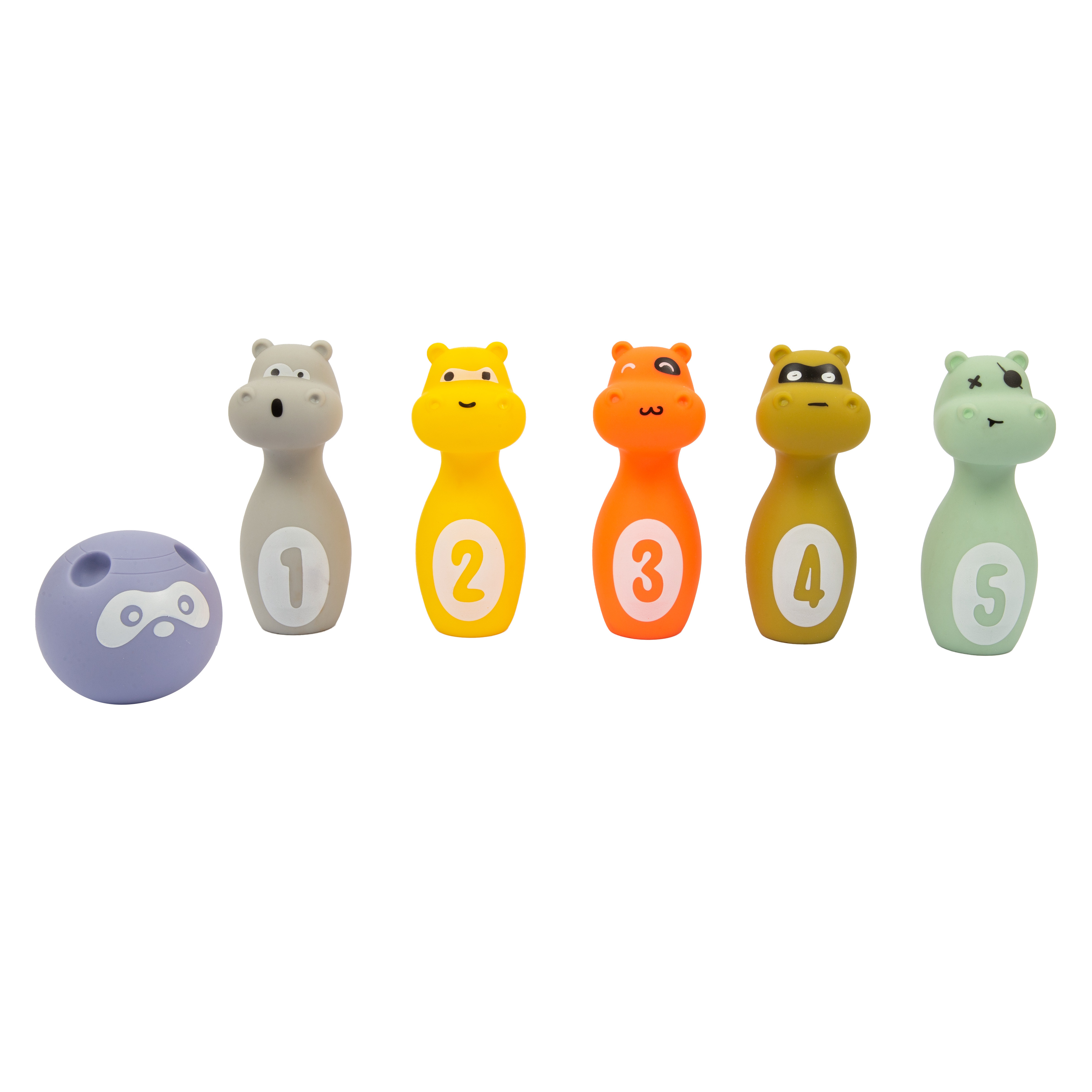 5 colorati ippopotami da far cadere con la palla da bowling. Morbidi e con suono