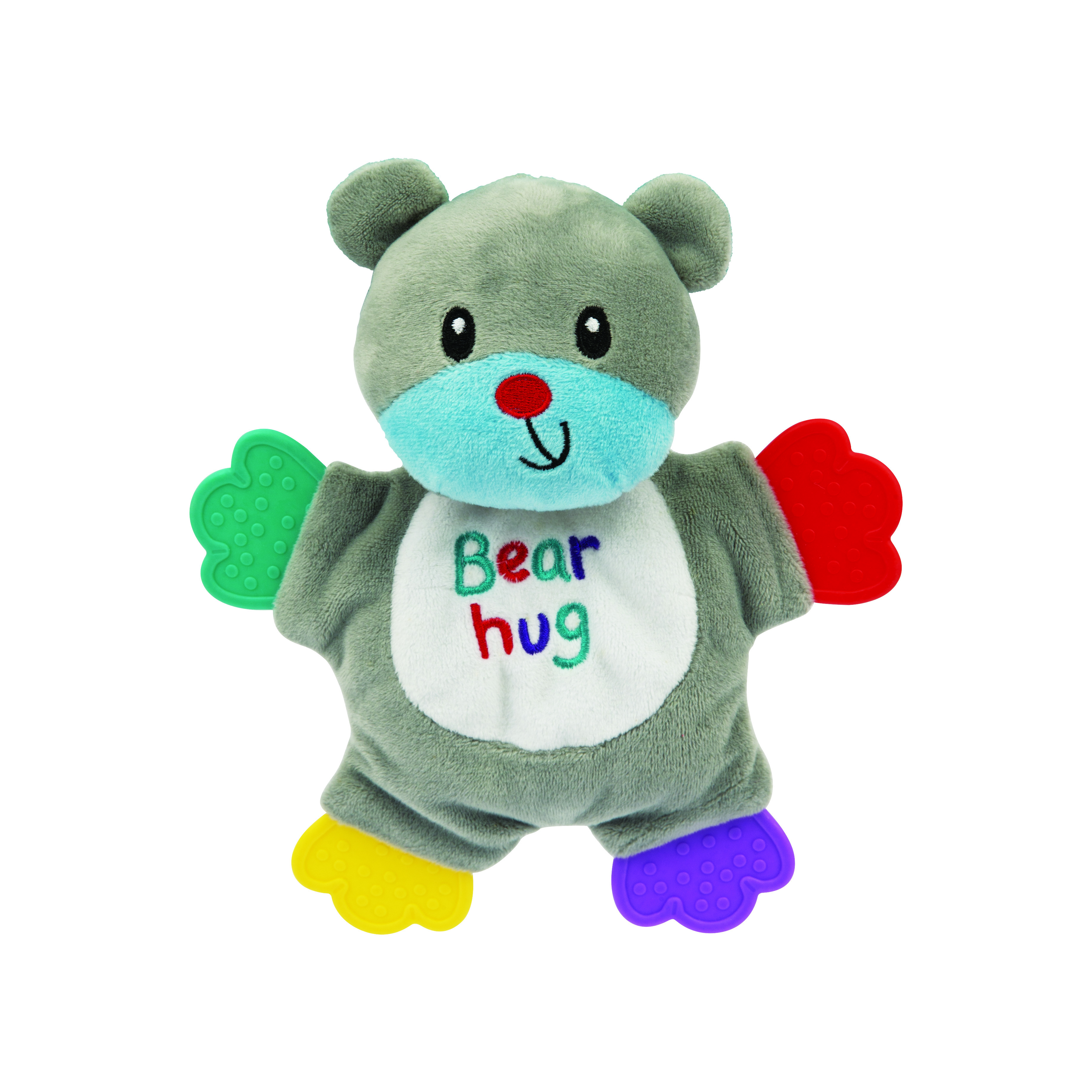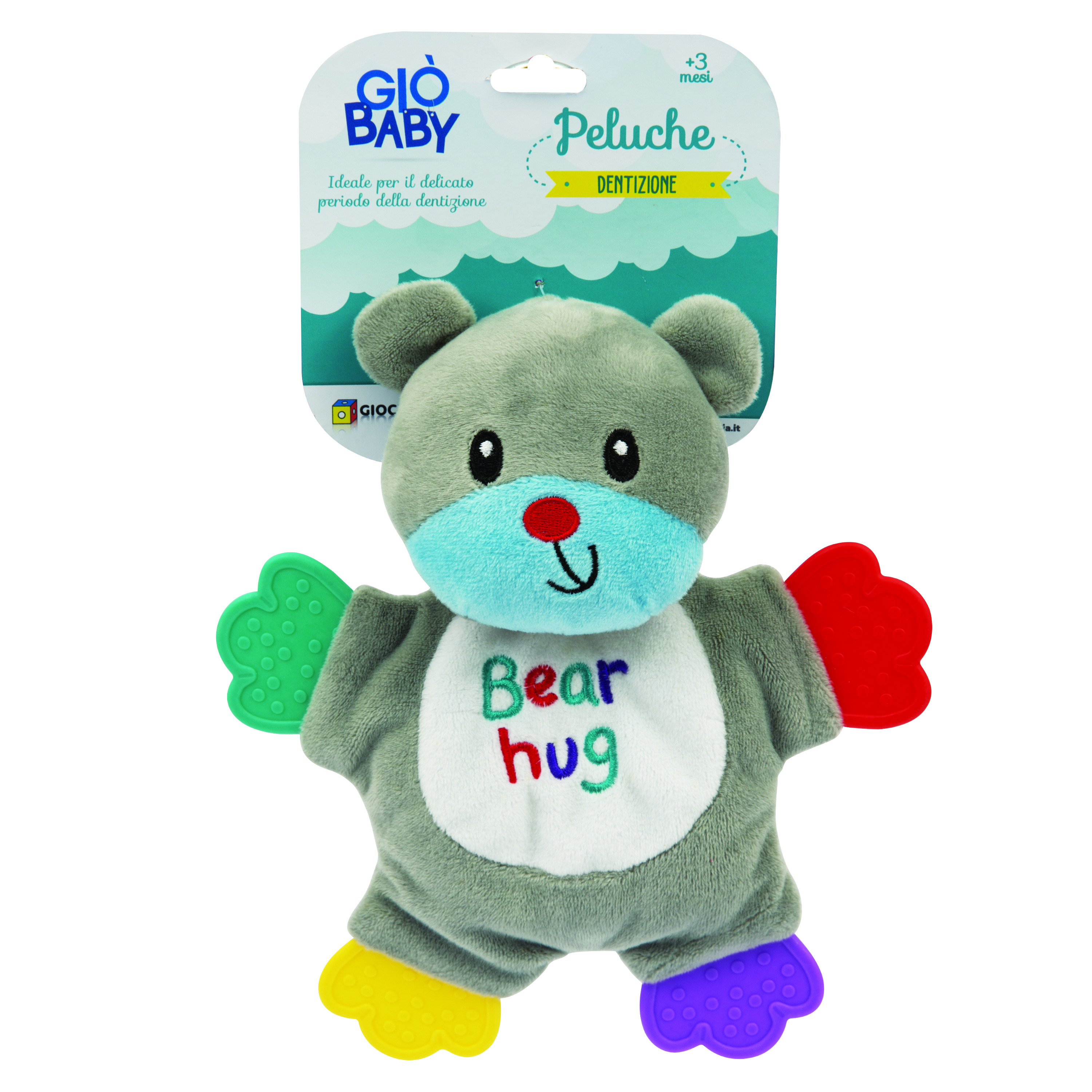 Morbido peluche con zampe in plastica da mordicchiare per aiutare la dentizione del neonato. Disponibile in due modelli.