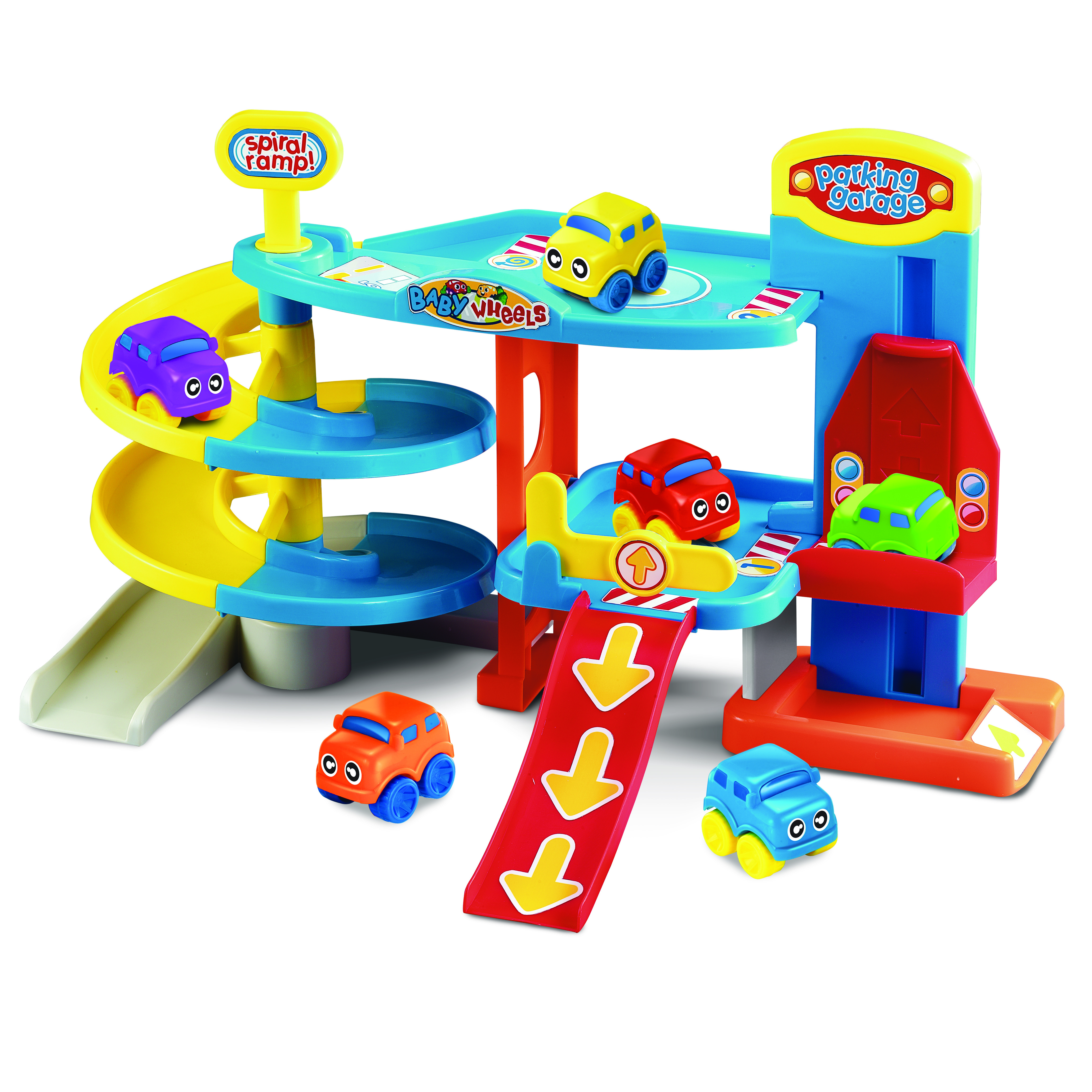 Un divertente playset su due piani con ascensore funzionante, sbarra mobile, rampe a spirale e 6 ruotallegri inclusi.