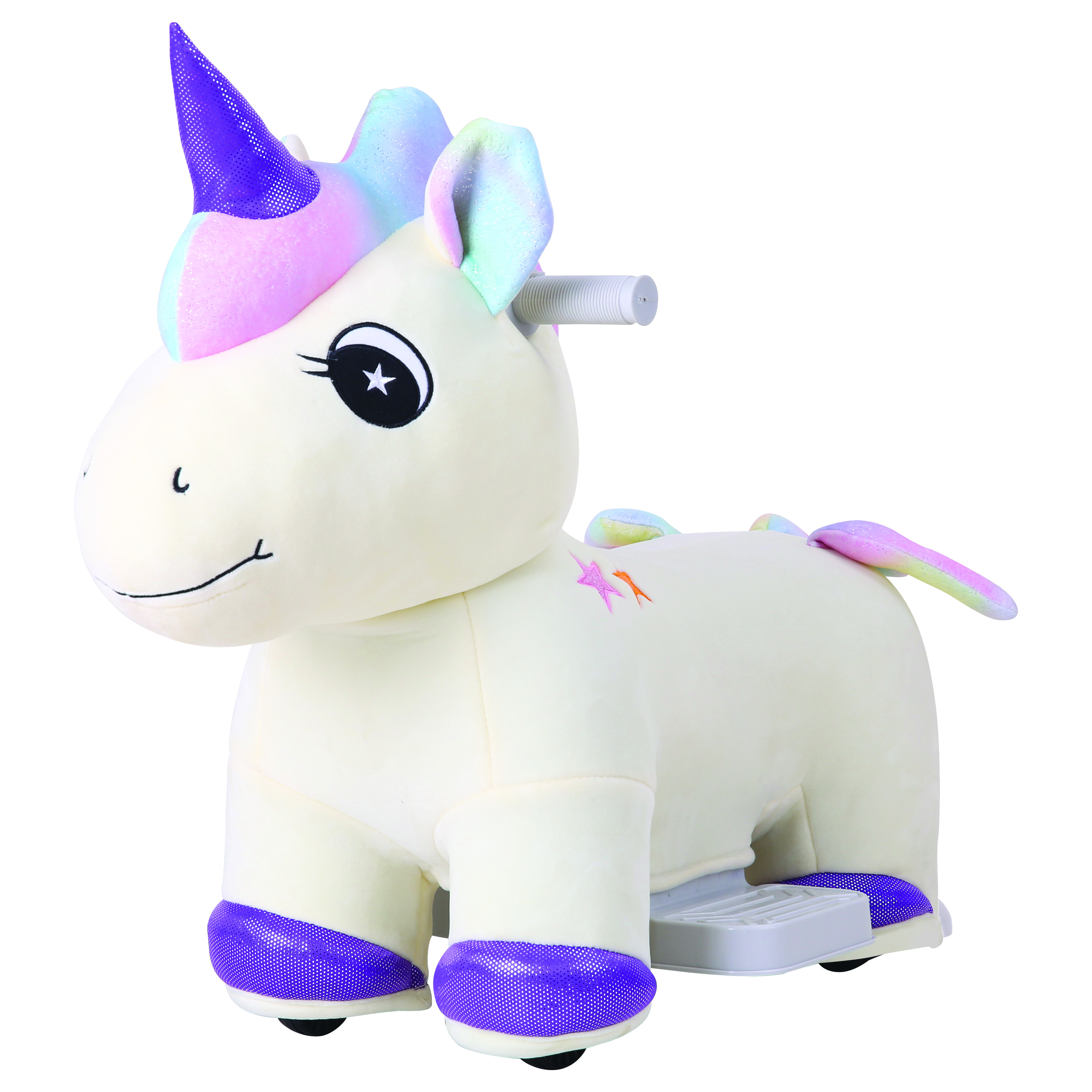 Dolce unicorno cavalcabile in peluche con funzionamento in avanti, destra/sinista, si guida come una piccola moto con batteria 6v 4,5
