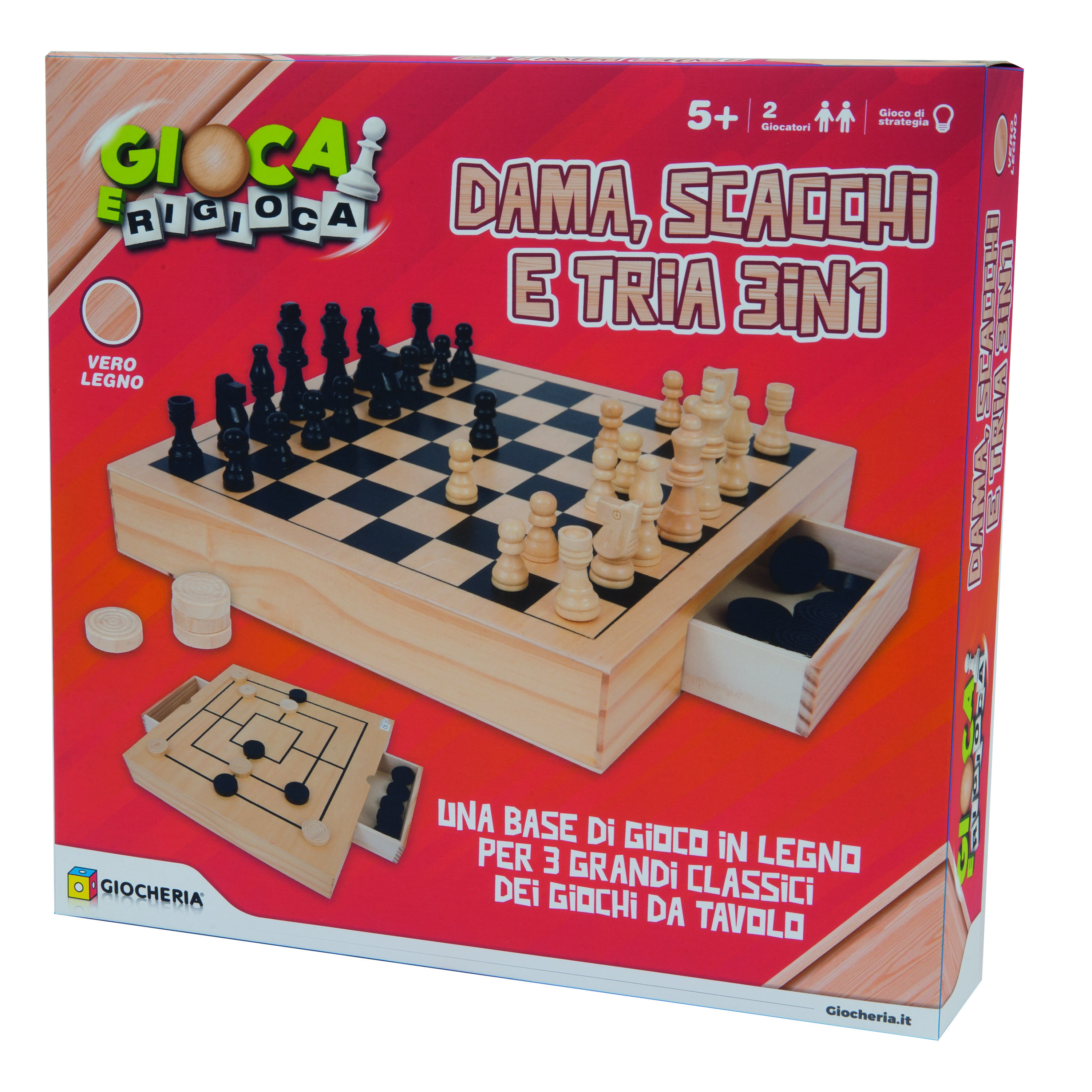 GIOCA e RIGIOCA - Dama, Scacchi e Tria in Legno con Cassettino