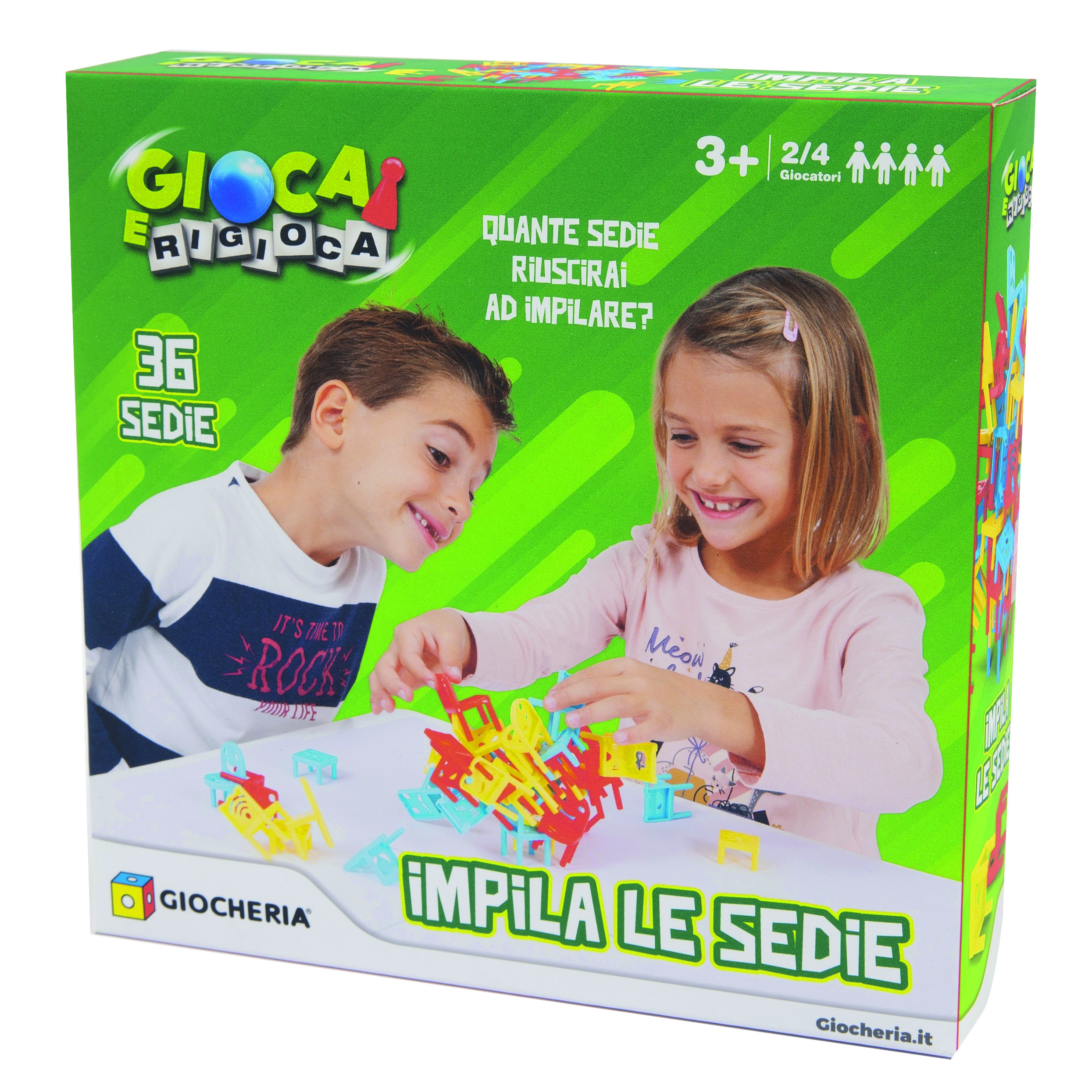 Gioco divertente adatto a tutti. 36 sedie da impilare. Vince chi crea una pila alta con più sedie possibili. Giocatori 2-4
