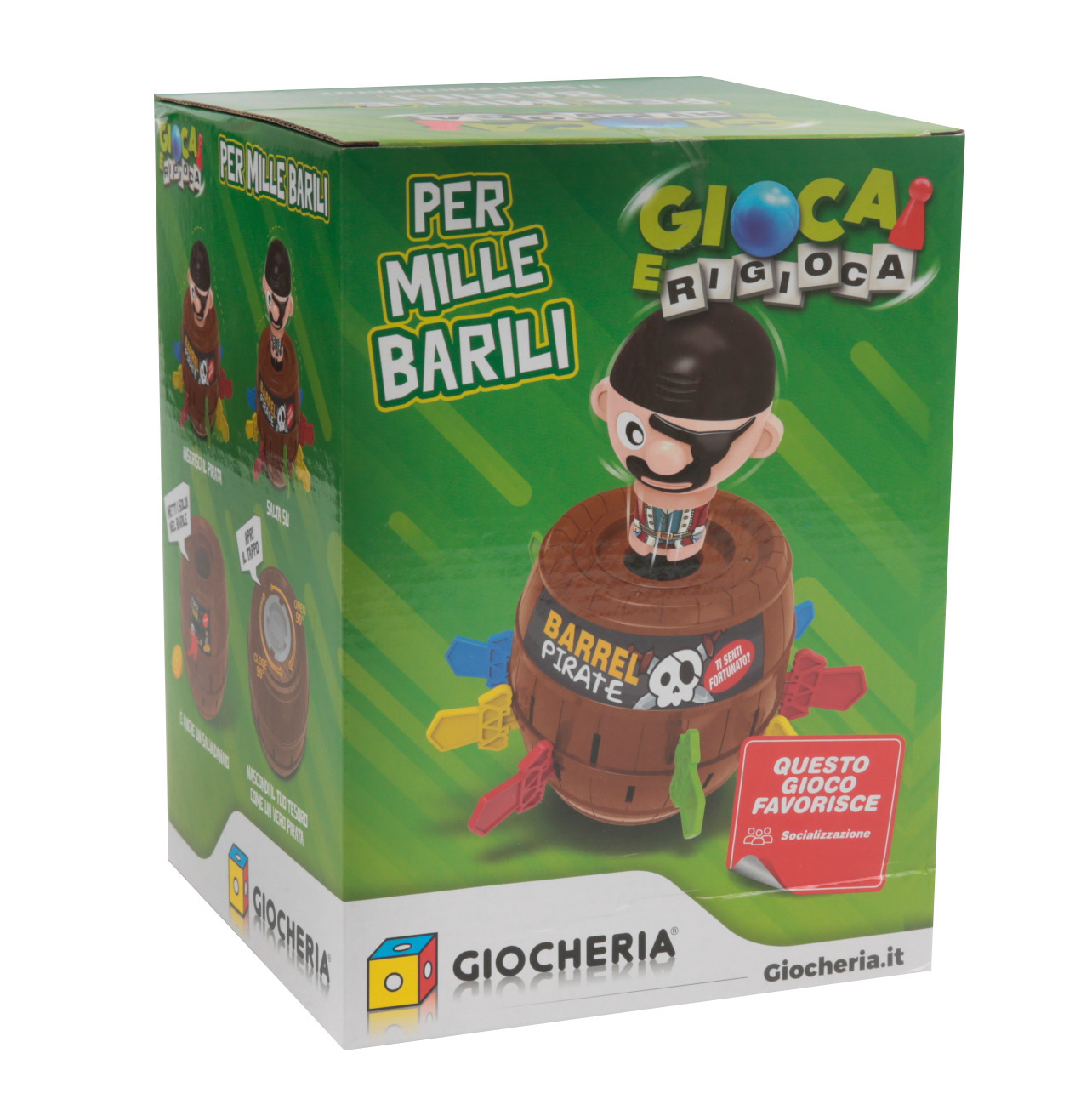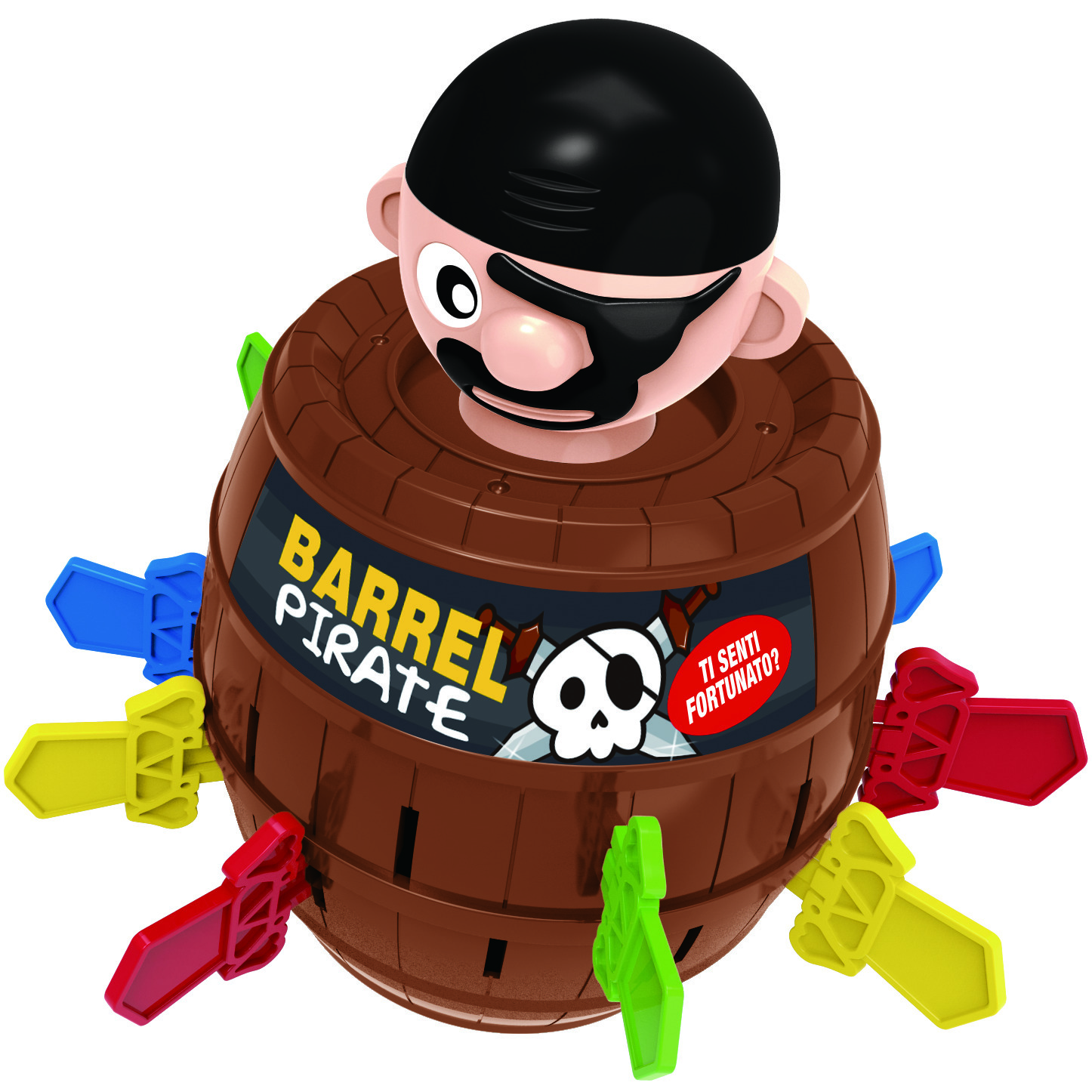 Per giocare bisogna inseirire il pirata nel barile e farlo girare qualche volta. Vince il giocatore che non fa saltare in aria il pirata. Contiene 1 barile/salvadanaio, 1 pirata e 4 set di spade colorate. Num Giocatori: 2-4