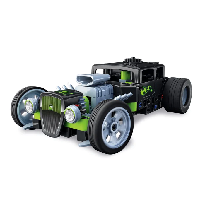 Il kit contiene oltre 120 pezzi per costruire 2 diversi modelli dotati di meccanismi a trasmissione.Il manuale illustrato permette di assemblare l'hotrod passo dopo passo.