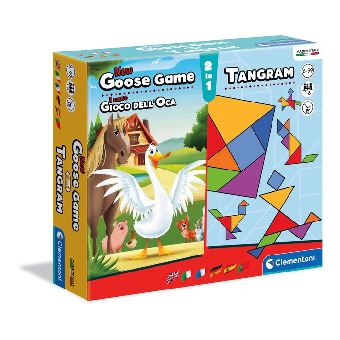 Due giochi in uno e il divertimento raddoppia! Uno speciale set con il nuovo gioco dell'oca e il tangram per divertirsi in compagnia di parenti e amici.