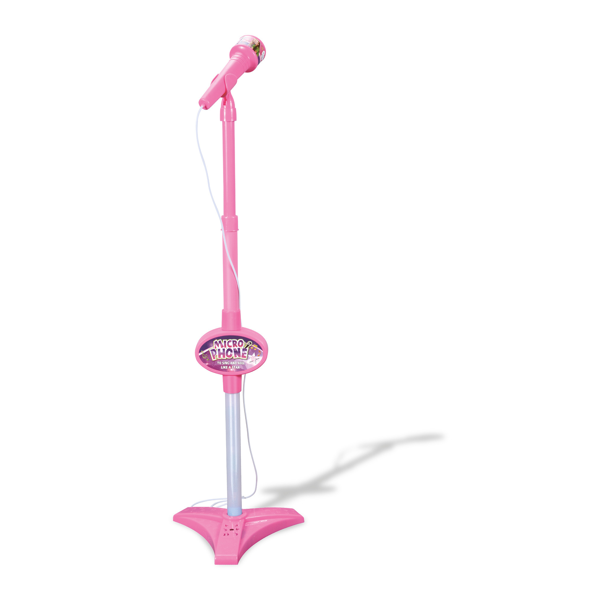 Microfono ad asta con amplificatore sulla base, effetti sonori e regolazione del volume. Collegamento con smartphone e lettori mp3 per aggiungere musiche e canzoni, scattare e foto e fare video.