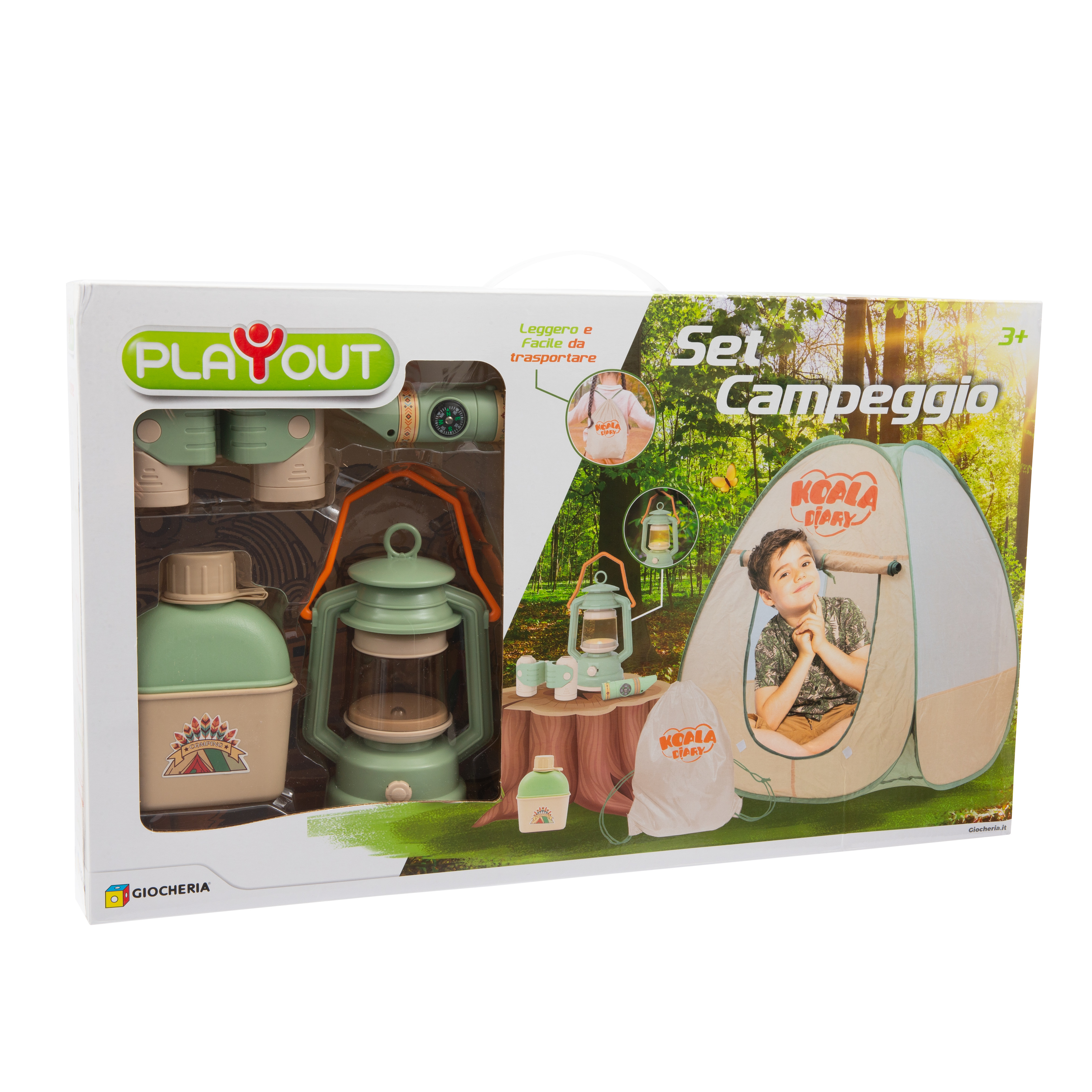 Set da campeggio facile da trasportare per mille avventure. Contiene : 1 tenda, 1 zaino, 1 lampada, 1 borraccia, 1 fischietto , 1 binocolo, 1 corda corta , 1 corda lunga e 4 anelli .