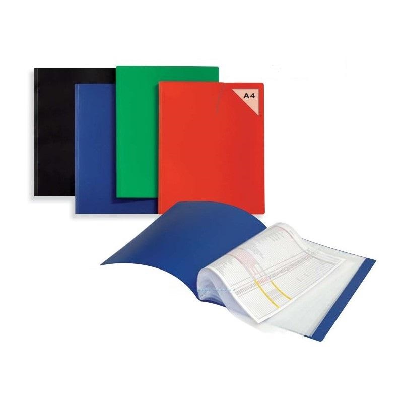 All’interno buste formato A4 trasparenti finitura lucida.In 4 colori assortiti: nero, blu, rosso e verde.