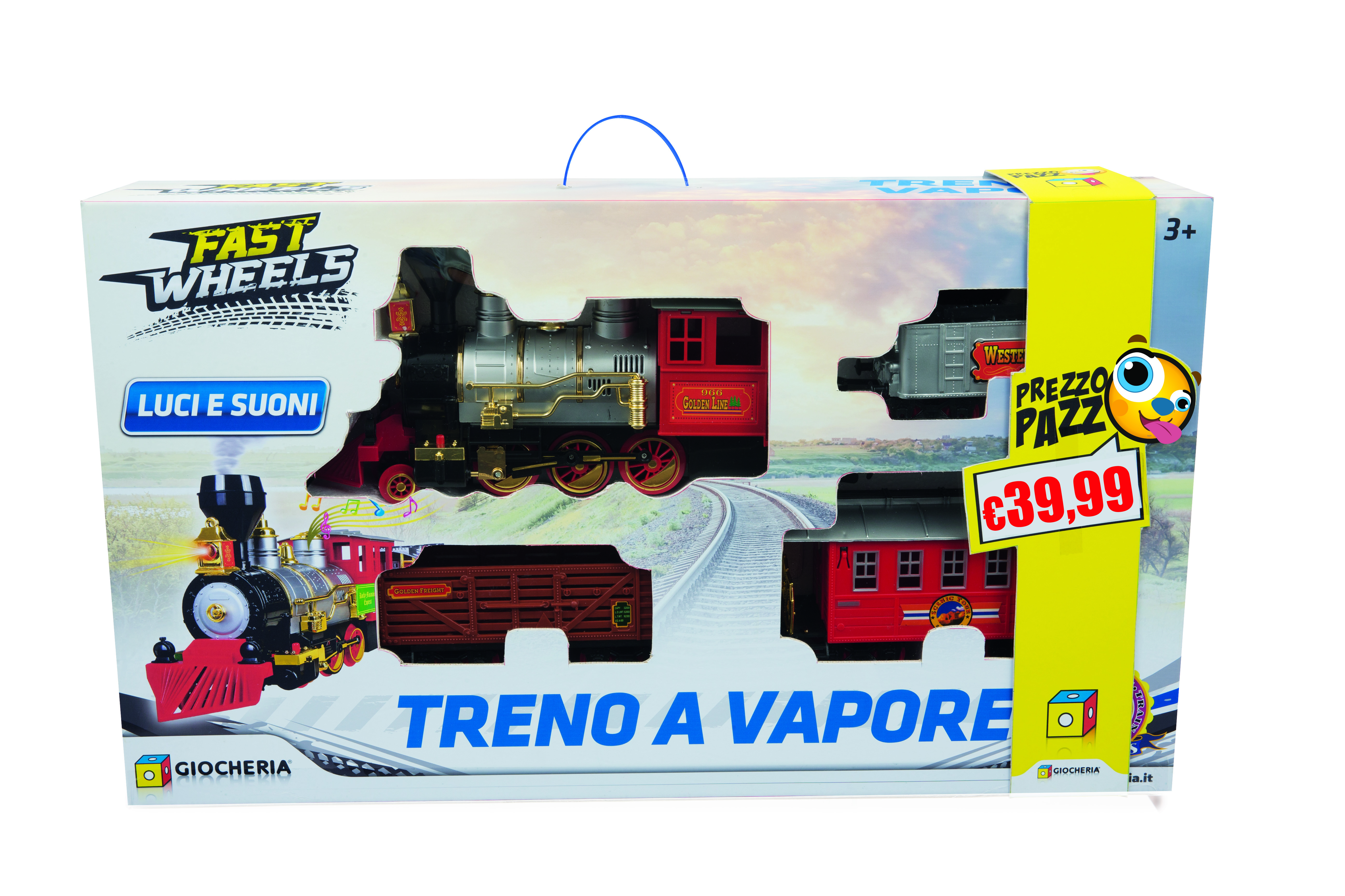 Treno classico su rotaie, con luci, suoni ed effetti di fumo realistici.