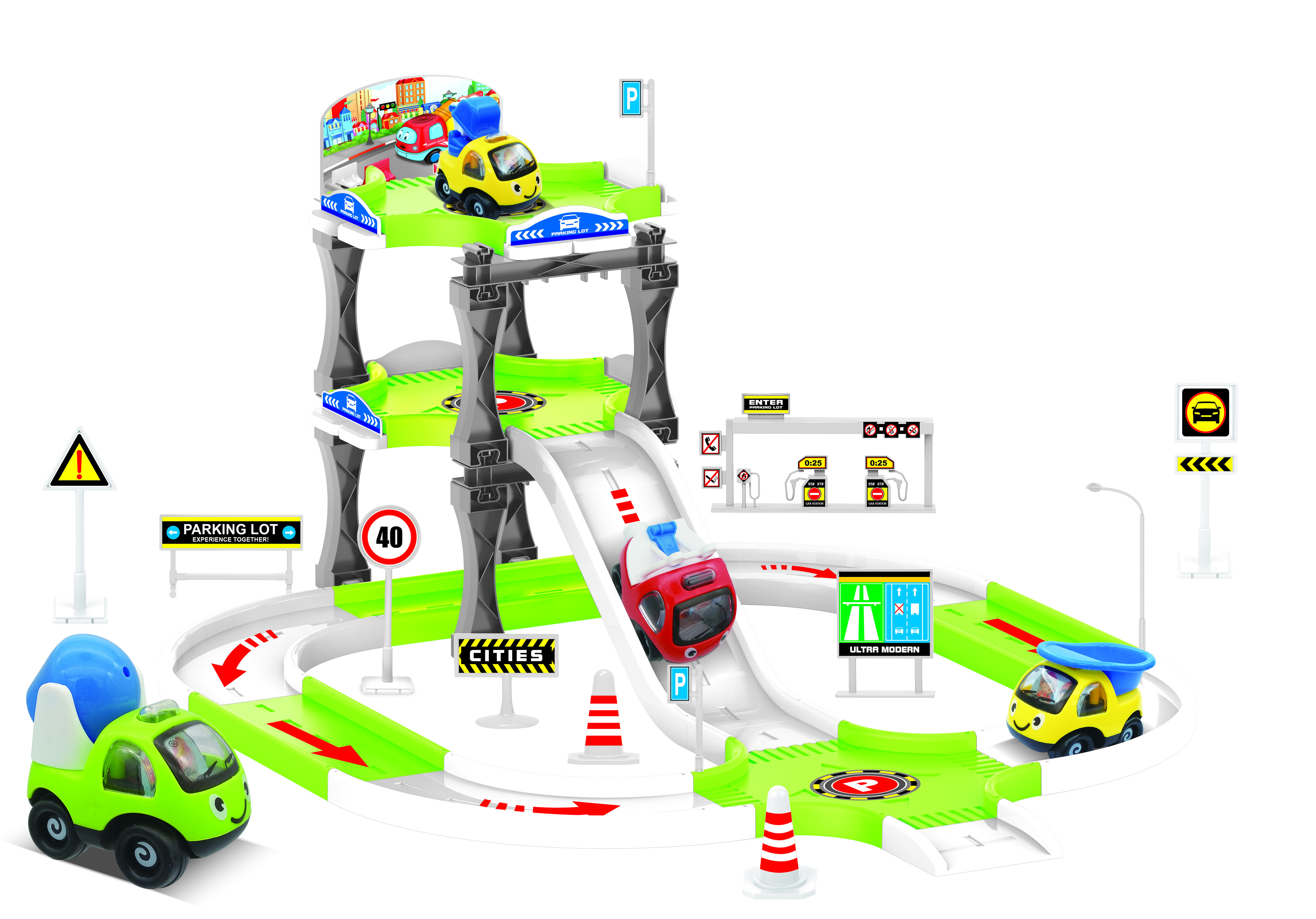 Parcheggio multipiano per età prescolare con rampe e con 4 veicoli inclusi
