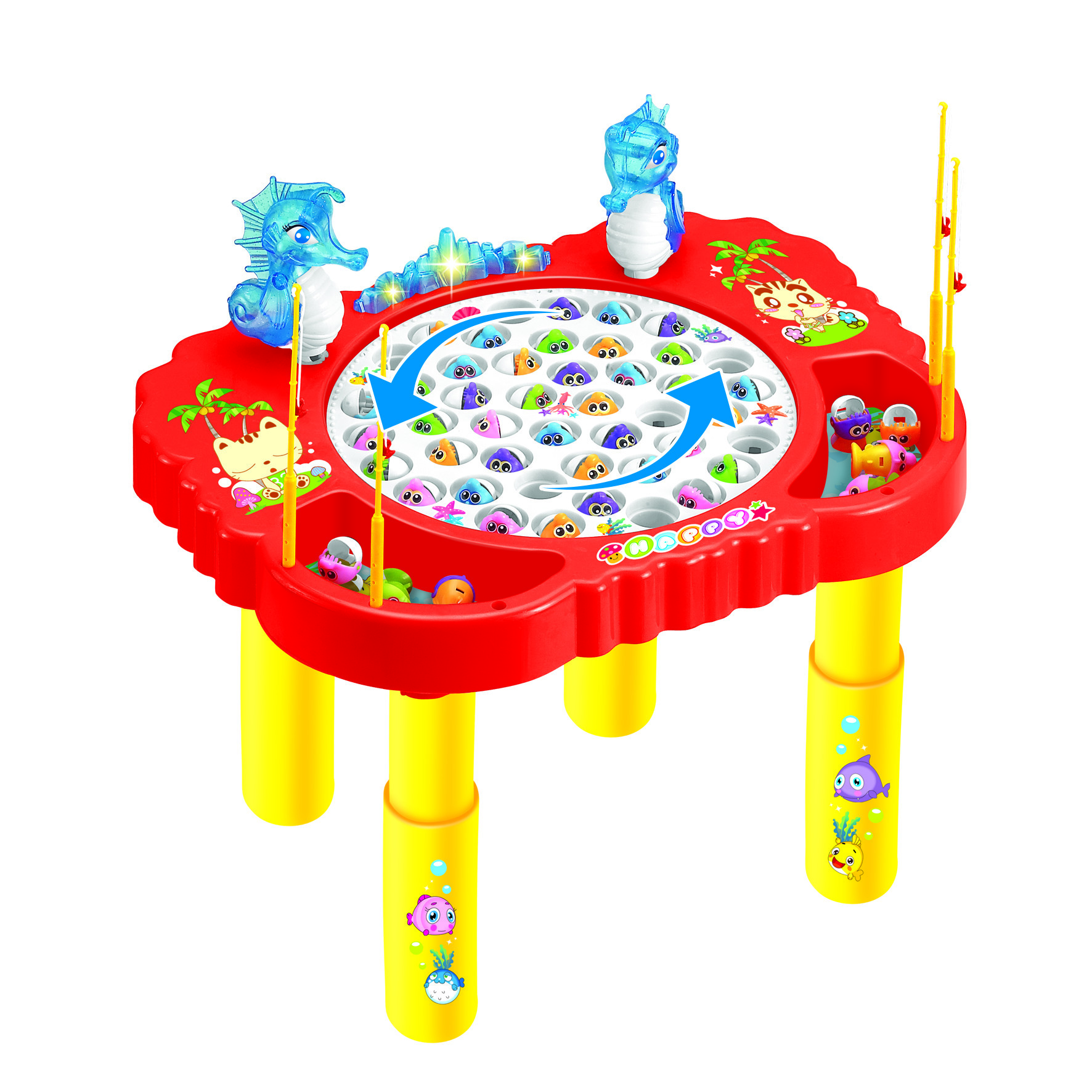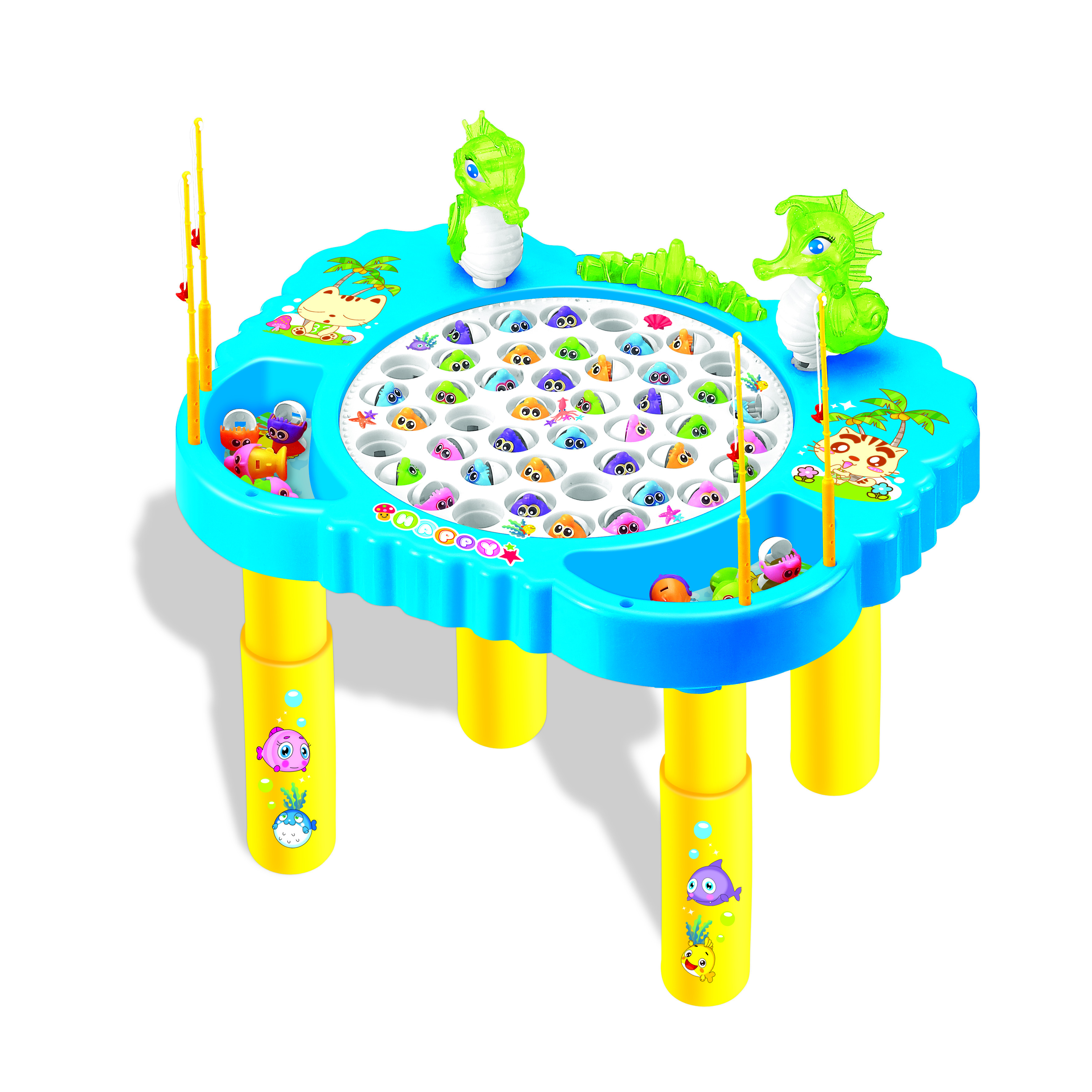 Base di gioco del classico pesca pesci in una versione a tavolino, con luci e suoni. Include tavolino con base di gioco ed elementi decorativi, 45 pesciolini e 4 canne da pesca. Num. Giocatori: 2-4