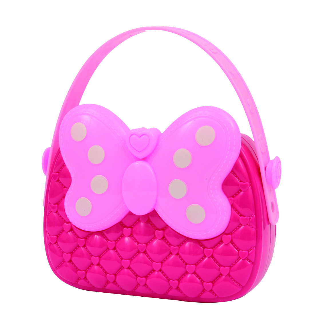 Borsetta in plastica con motivo di ricamo in engrave, manico rigido e fiocco musicale sul fronte.