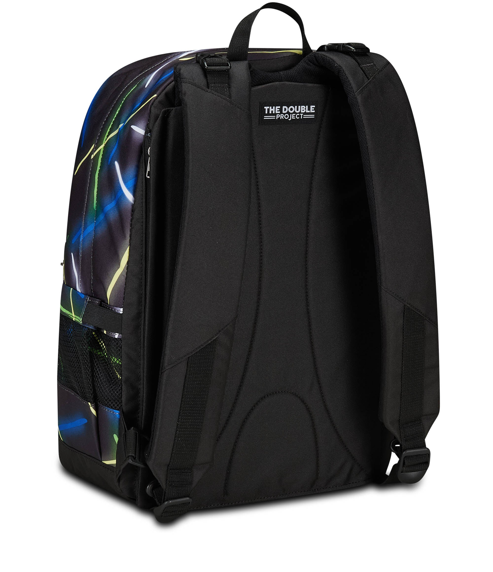 Earphones wireless con luci led, microfono integrato e custodia con base di ricarica. Zaino reversibile: un lato in fantasia, l'altro in tinta unita da personalizzare con i due marker abbinati allo zaino.