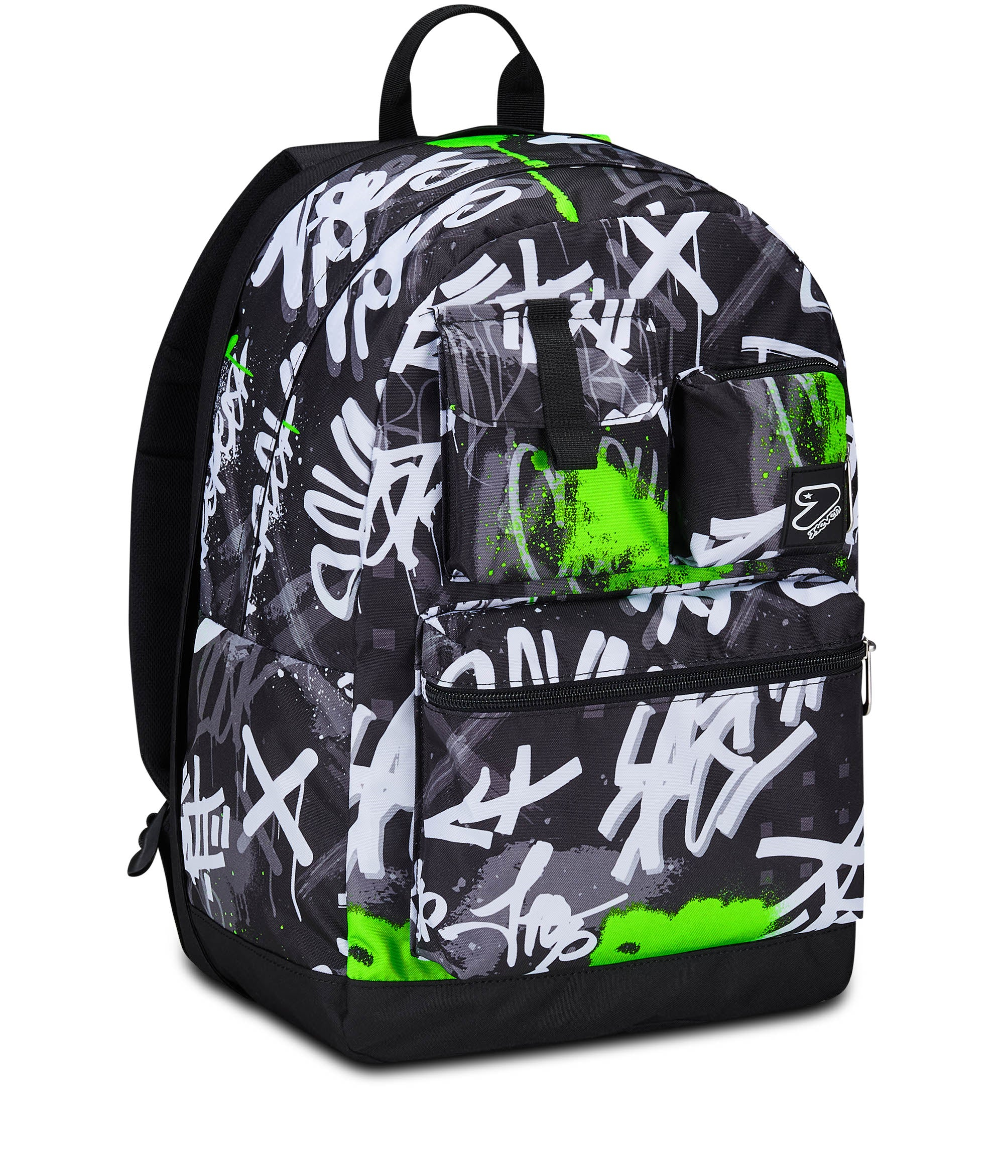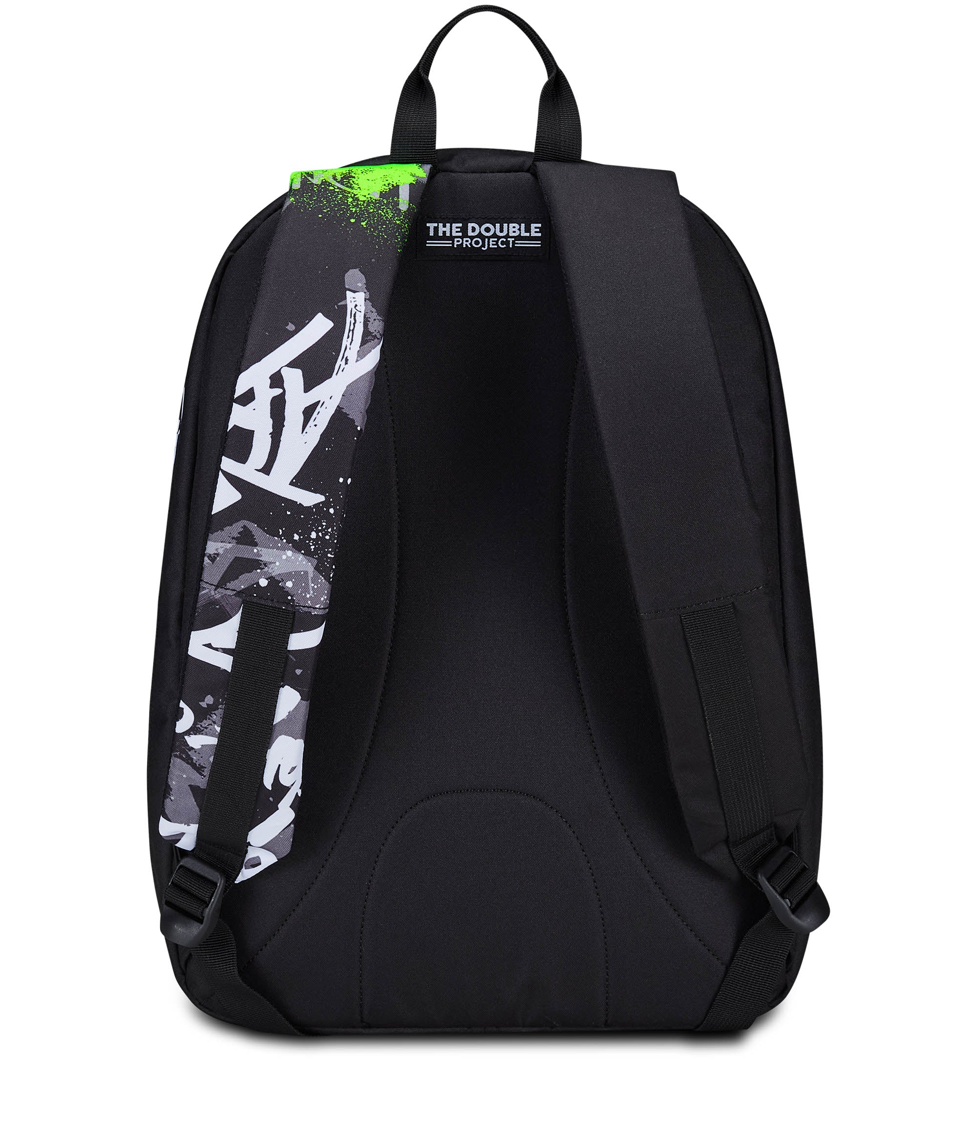 Tasca interna porta PC/tablet. Tasca frontale applicata su entrambi i lati. Lato in fantasia con tasca laterale porta borraccia in rete ed elastico.