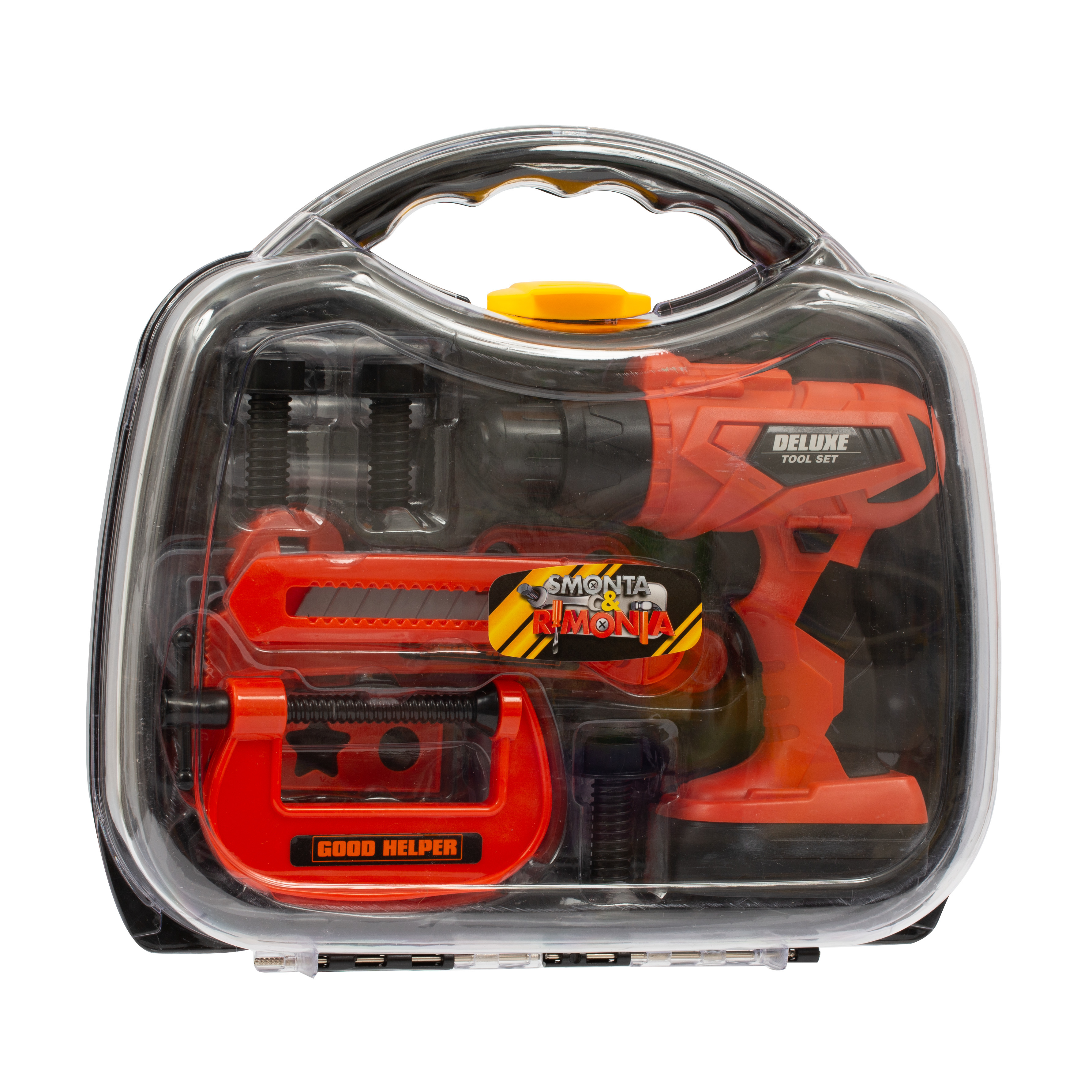 Cassetta degli attrezzi con trapano funzionante e 18 accessori inclusi.