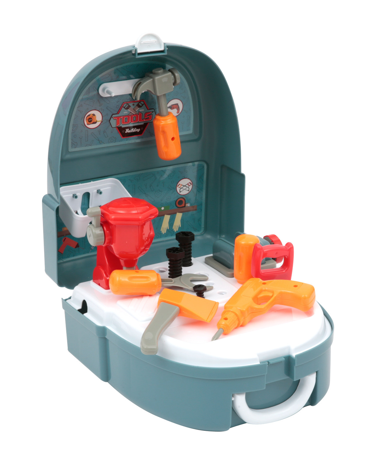 Pratico zaino che si trasforma in un piccolo banco lavoro, completo di tanti attrezzi per il fai da te.