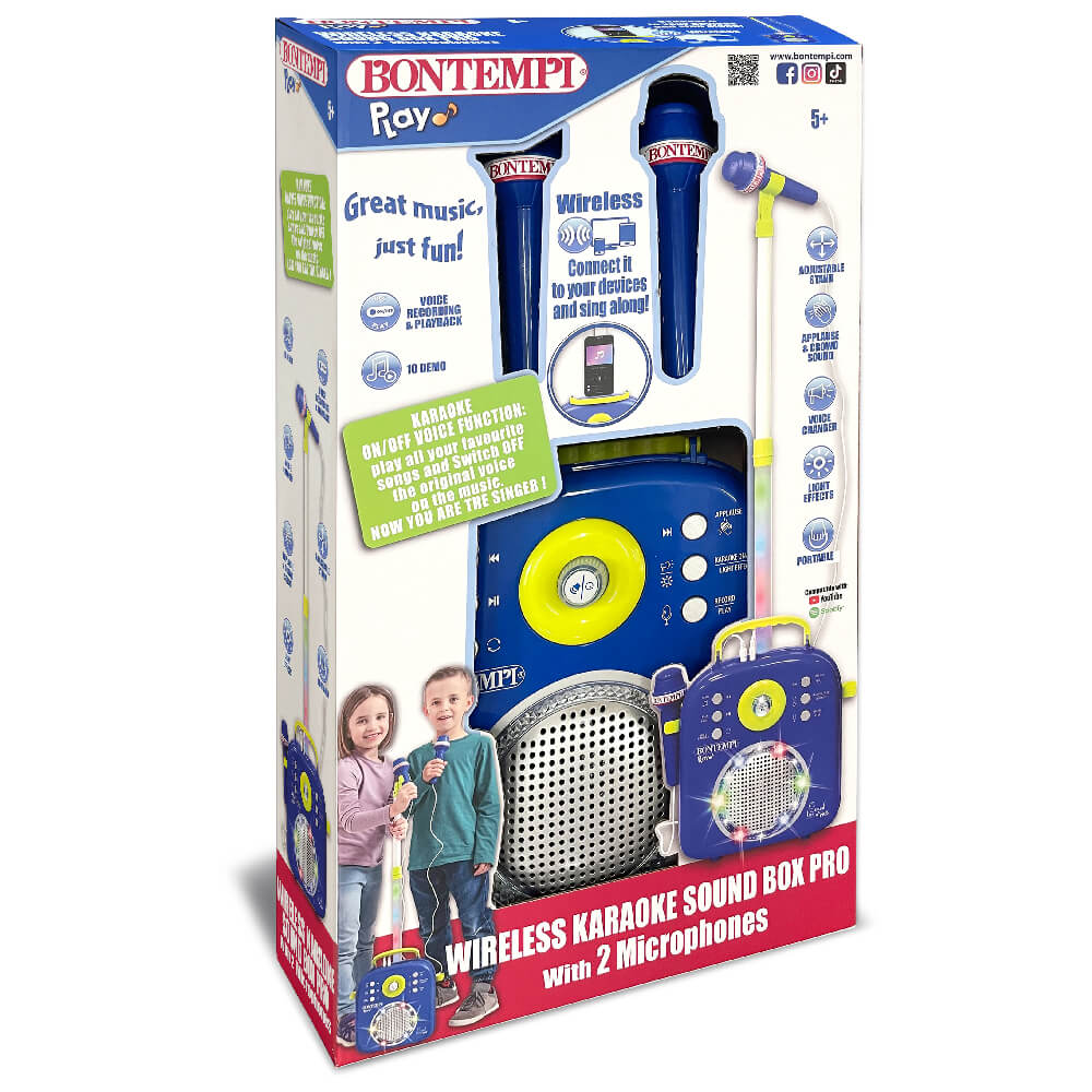 WIRELESS KARAOKE SOUND BOX PRO CON 2 MICROFONI • Karaoke con selettore On/Off per la voce: riproduci le tue canzoni preferite, eliminando la voce dalla musica. ORA il cantante sei tu! • Asta con effetti luminosi regolabile in altezza • 10 brani preregistrati • Regolazione del volume • Effetti applausi e brusìo di folla • Effetti luminosi • Tasto attivazione effetti luminosi • Registrazione e riascolto della voce • Effetto cambiavoce • Controlli Volume e avanzamento brani MP3 • Presa per USB flash drive (non fornita) • Alimentazione: tramite presa standard USB Tipo-C o con 3 batterie da 1,5V tipo R6/AA (non fornite) • Dim.: 220x960x90 mm