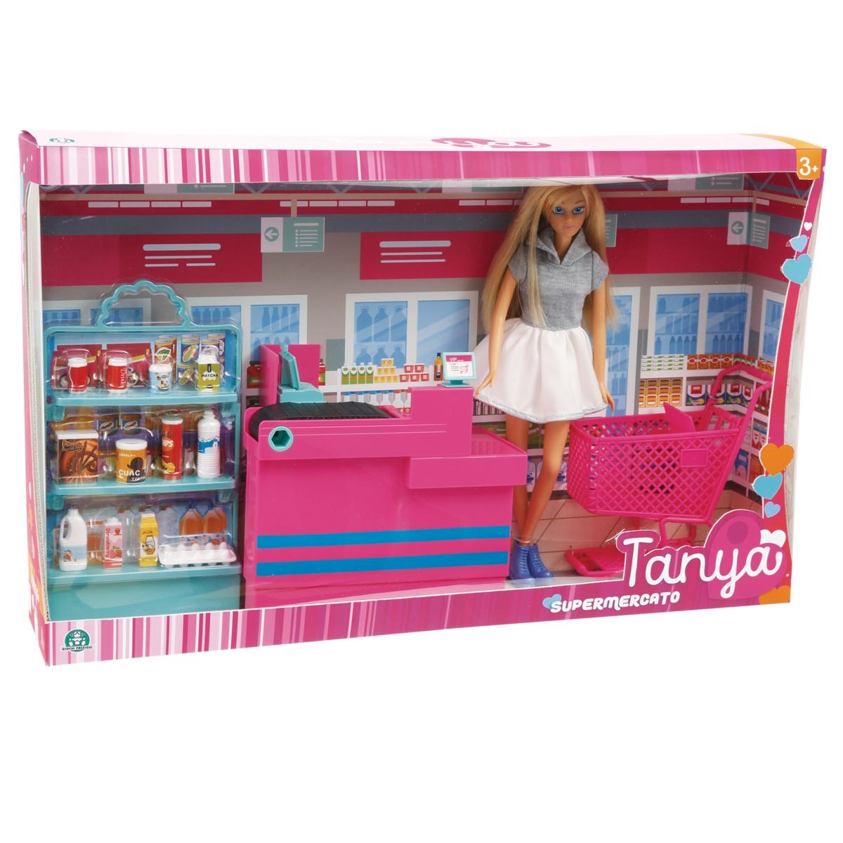 E' ora della spesa! Divertiti con Tanya e tanti accessori. Include: 1 bambola, 1 carrello, 1 bancone, 1 scaffalatura con tanti accessori. Girando la manovella, il ripiano scorre verso la cassa.
