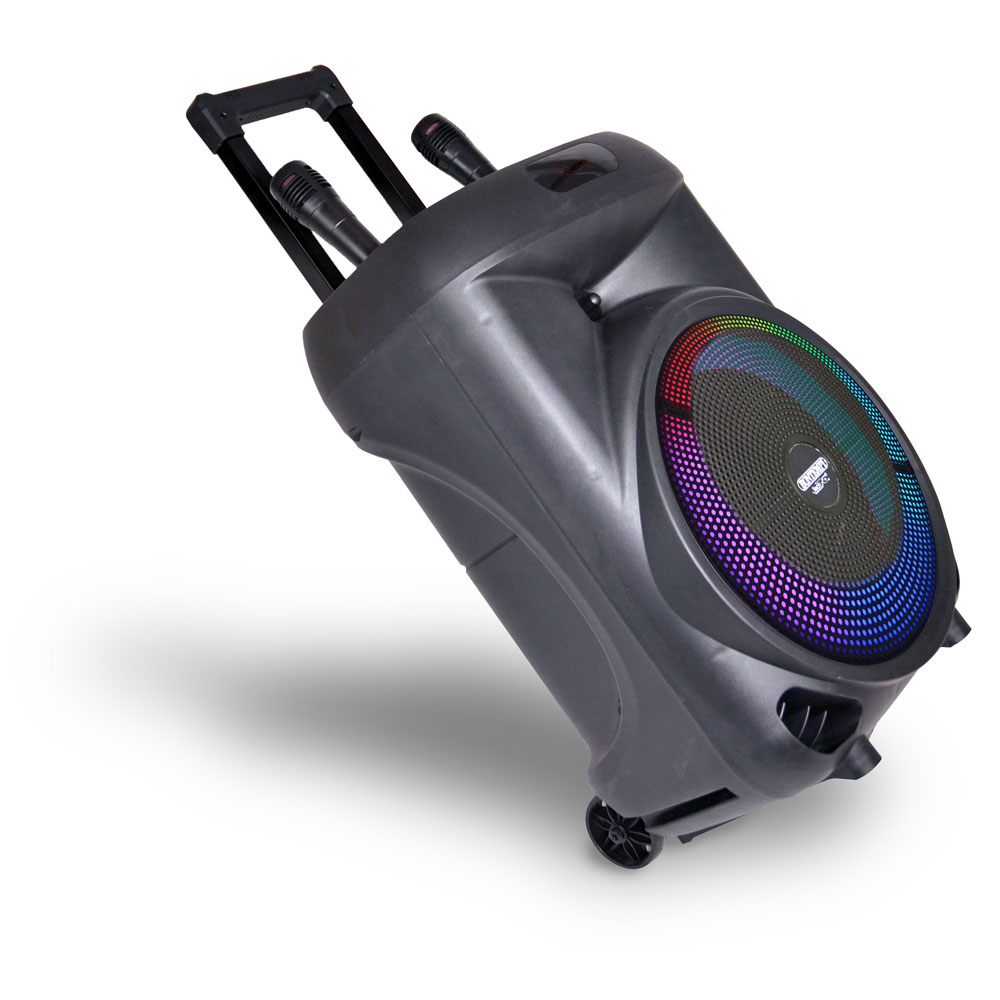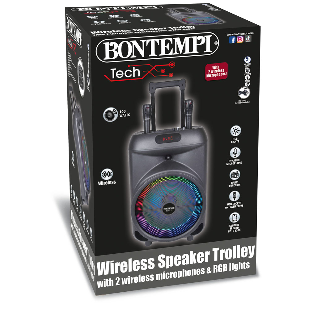 Cassa acustica wireless trolley con 2 microfoni senza filo e luci RGB • Display • Funzione TWS: puoi connettere in modalità wireless un'altra cassa uguale e godere di una qualità del suono stereo • Puoi ascoltare musica/audio: - da USB Flash Drive (non fornita); - da micro SD card (non fornita); - da smartphone, tablet, PC/Laptop, ecc. (cavetto di connessione incluso); / utilizzando la connessione wireless (Bontempi491080) • Funzione radio • Regolazione dell’effetto eco • Regolazione volume del microfono • Tasto attivazione effetti luminosi • Presa USB per Flash drive • Slot per micro SD card(TF) • Presa per sorgente musicale esterna (lettore MP3, smartphone, ecc.) - cavetto fornito • Presa USB Tipo-C per ricaricare la batteria al litio integrata (cavetto di carica fornito) • Dim.: 330x870x260 mm
