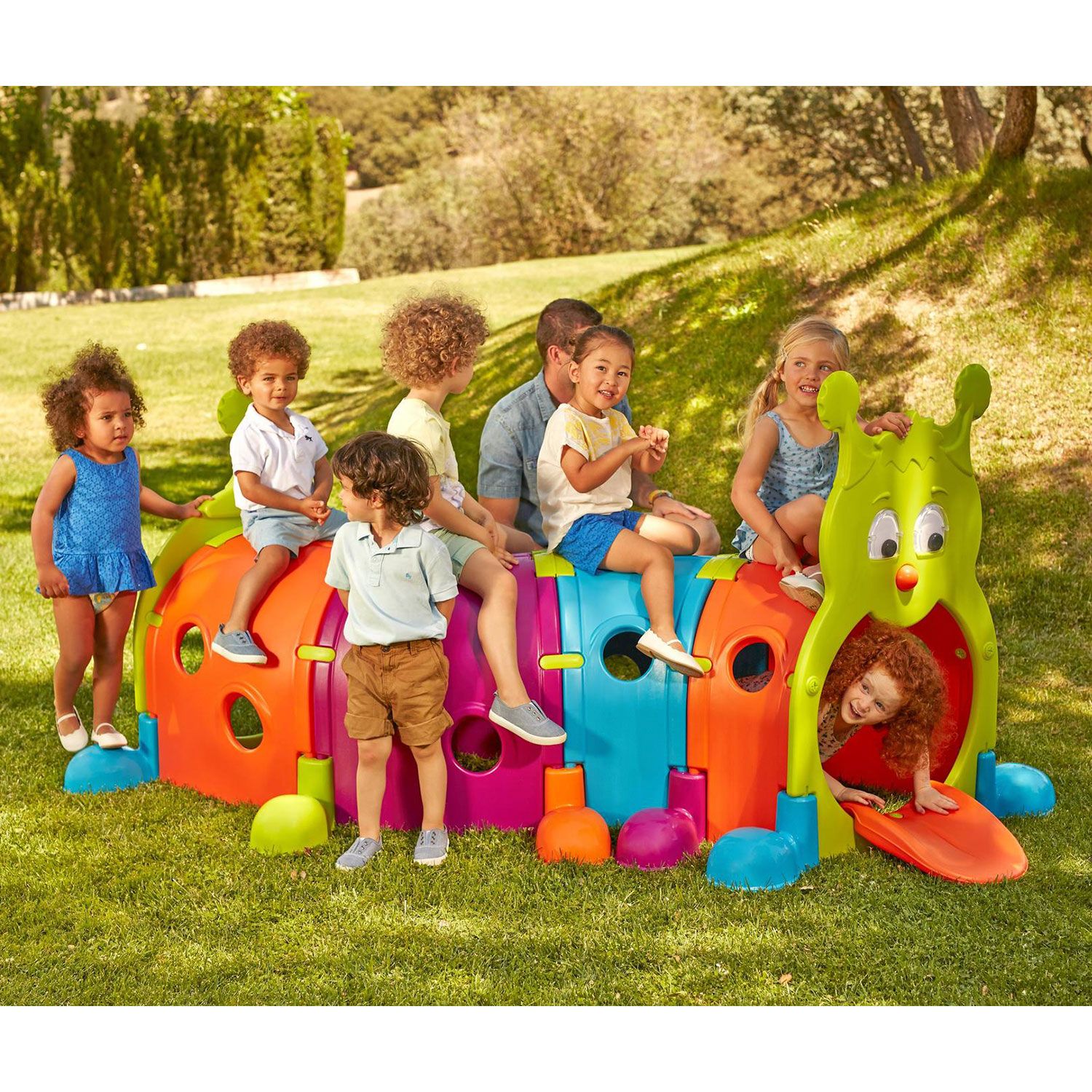 Il tunnel giocattolo con moduli colorati permette il montaggio in diversi modi. Include 4 moduli colorati. Sono disponibili moduli di espansione venduti separatamente per allungare il tunnel. È facile da montare, trasformare ed espandere. Il suo interno è un tunnel di 1,78 metri. Colori vivaci, resistenti alla luce del sole.