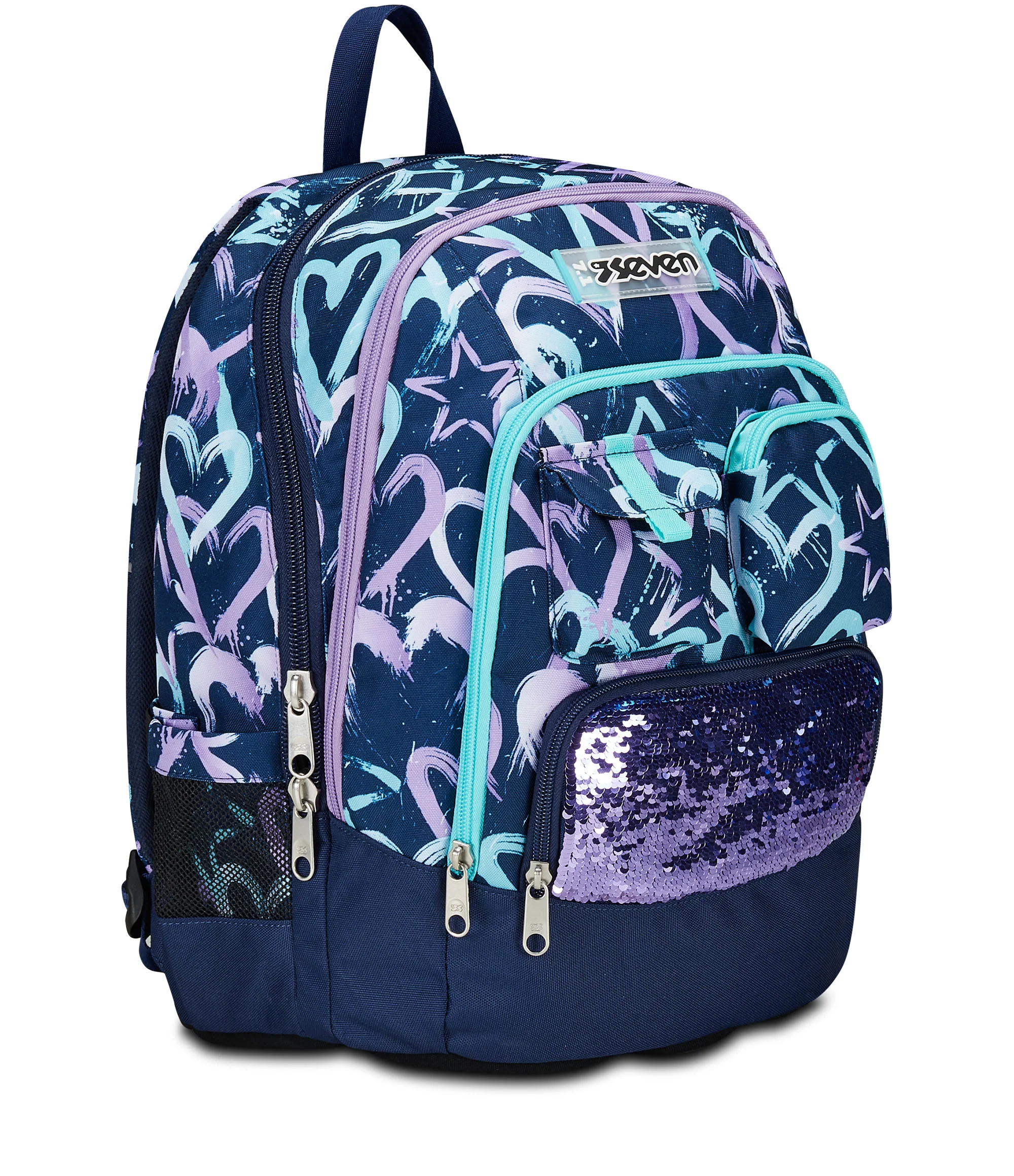 Zaino doppio scomparto con apertura dello scomparto principale facilitata e paillettes su tasca frontale.