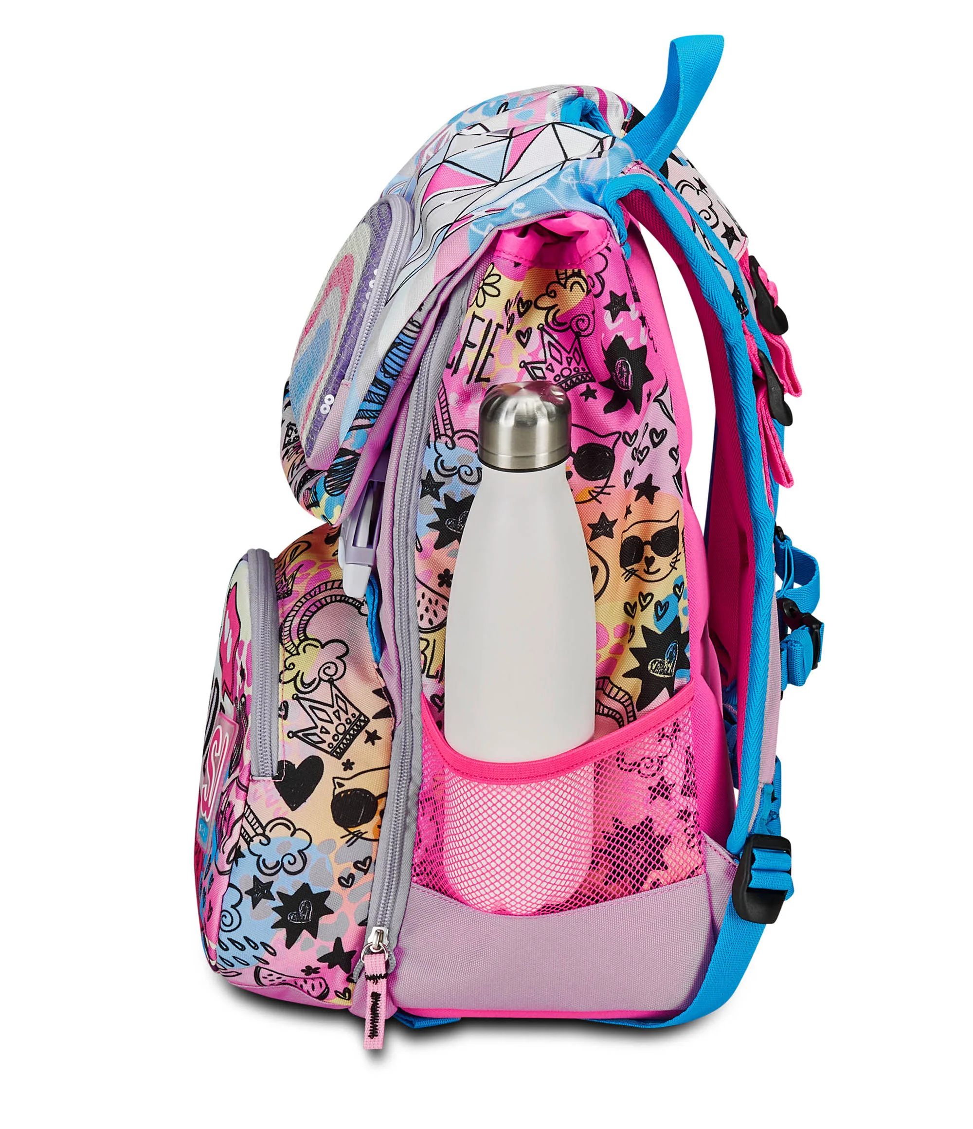 Zaino estensibile tramite zip laterali, dotato di inserti rifrangenti. Tasca sagomata a forma di arcobaleno sulla pattina, con paillettestrasparenti e chiusura con zip. Cinghia a vita amovibile e cinghia torace. Modello certificato IGR che ne conferma il design ergonomico
